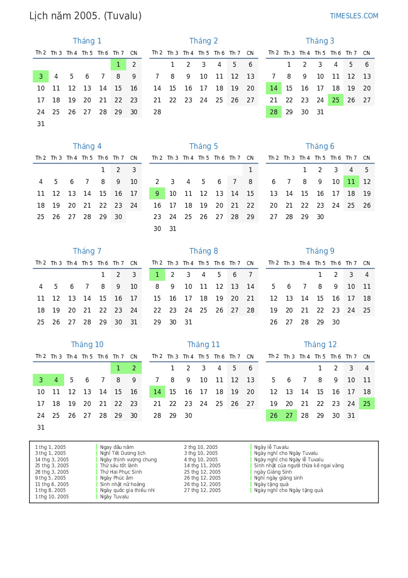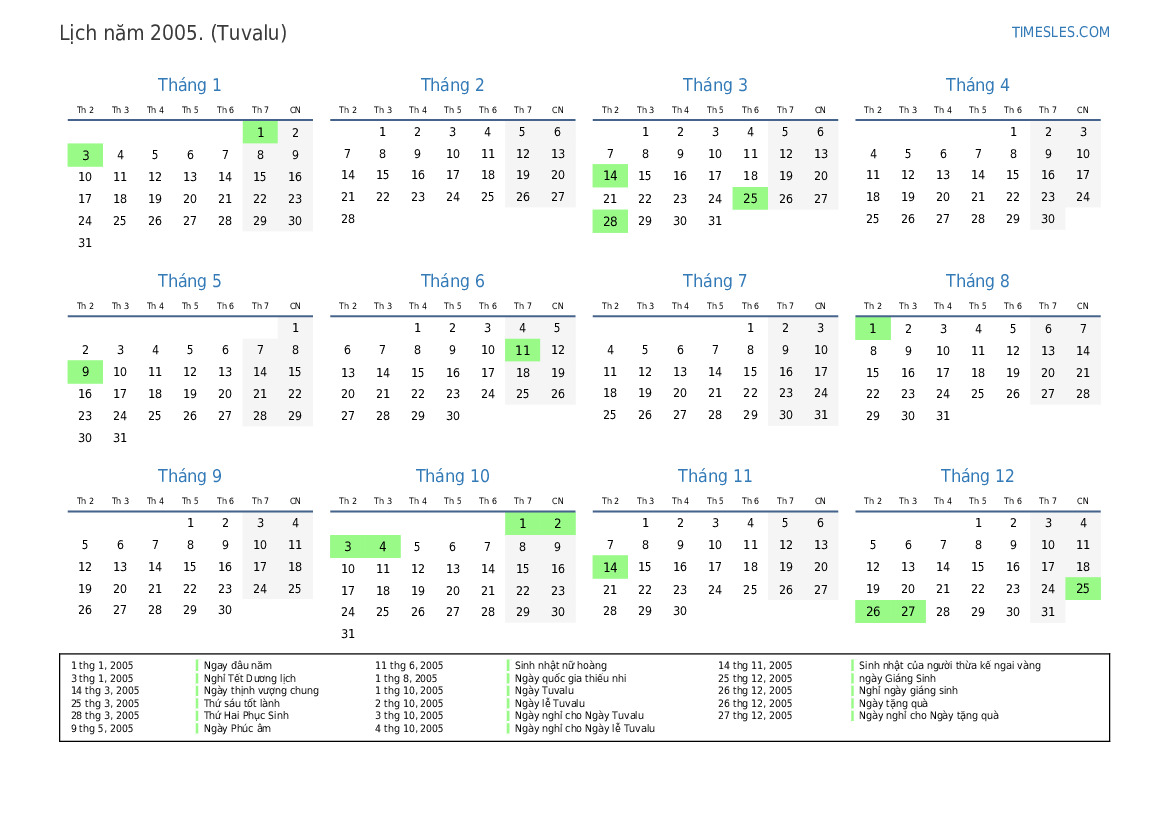 4 thg 10, 2005 Ngày nghỉ cho Ngày lễ Tuvalu