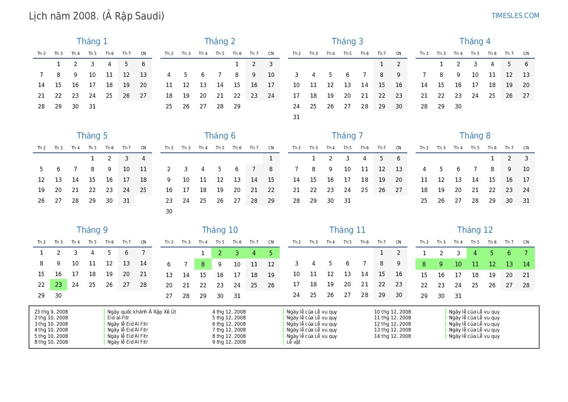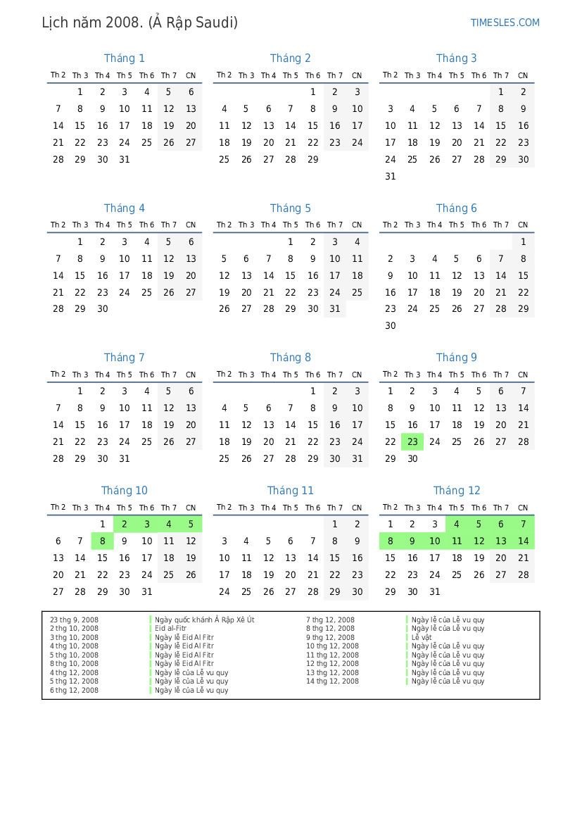 7 thg 10, 2008 Ngày lễ Eid al-Fitr (chỉ dành cho khu vực công)