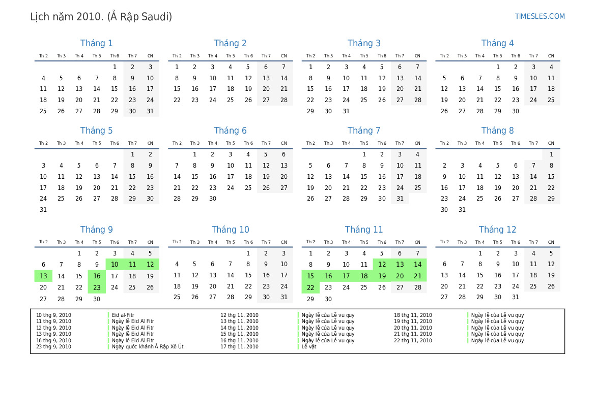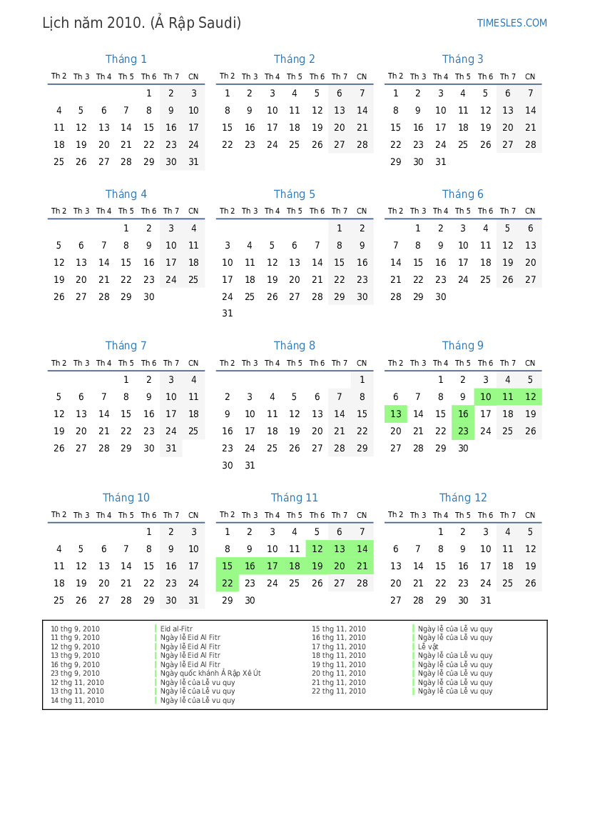 14 thg 9, 2010 Ngày lễ Eid al-Fitr (chỉ dành cho khu vực công)