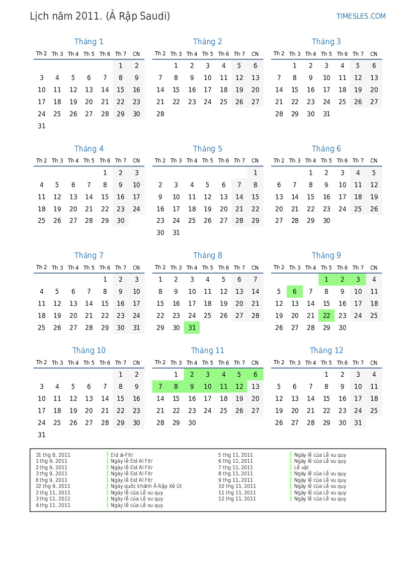 5 thg 9, 2011 Ngày lễ Eid al-Fitr (chỉ dành cho khu vực công)