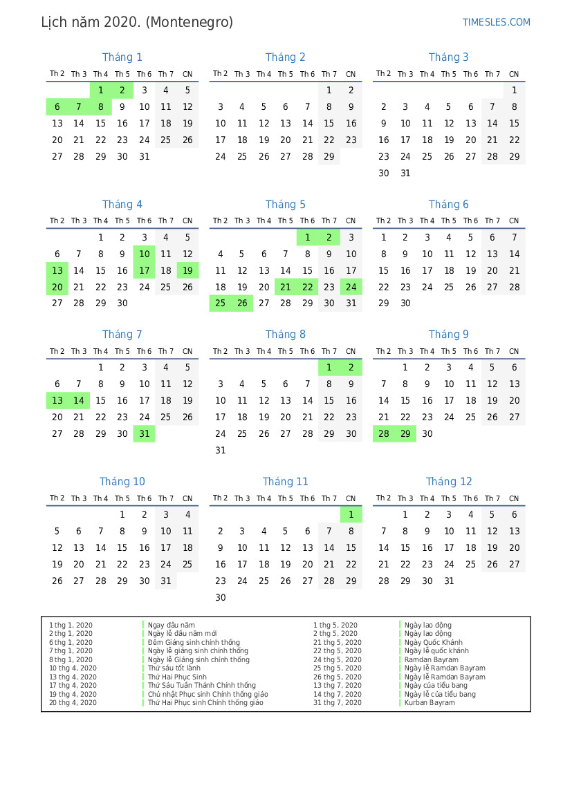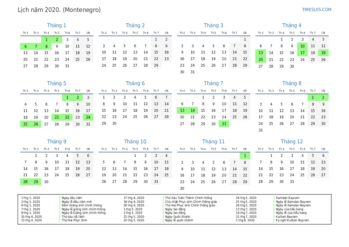 Lịch nghỉ lễ và cuối tuần trong năm 2020 cho Montenegro