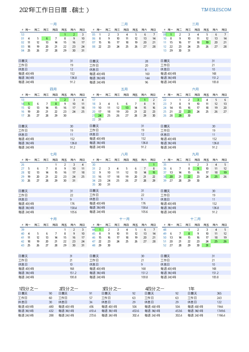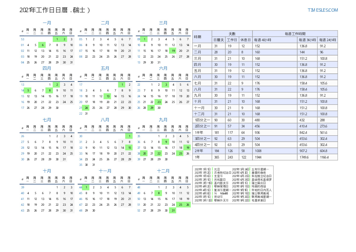 在瑞士下載並打印2021年第4季度帶有假日和周末的PDF工作日日曆