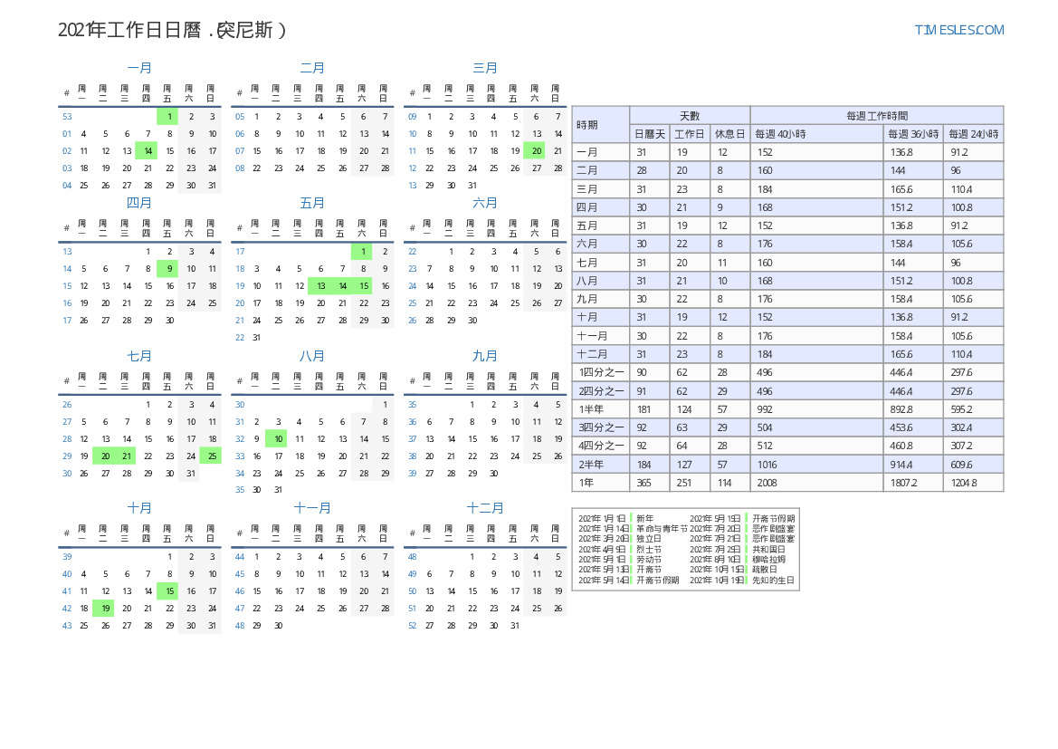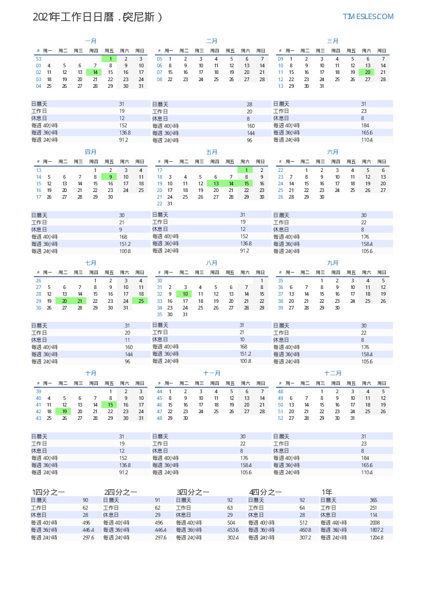 在突尼斯下載並打印2021年第4季度帶有假日和周末的PDF工作日日曆