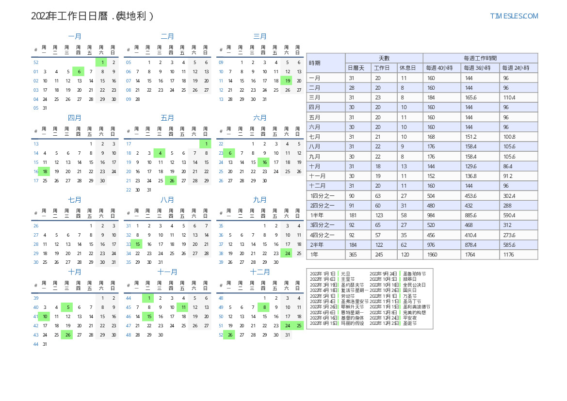 在奥地利下載並打印2022年第1季度帶有假日和周末的PDF工作日日曆