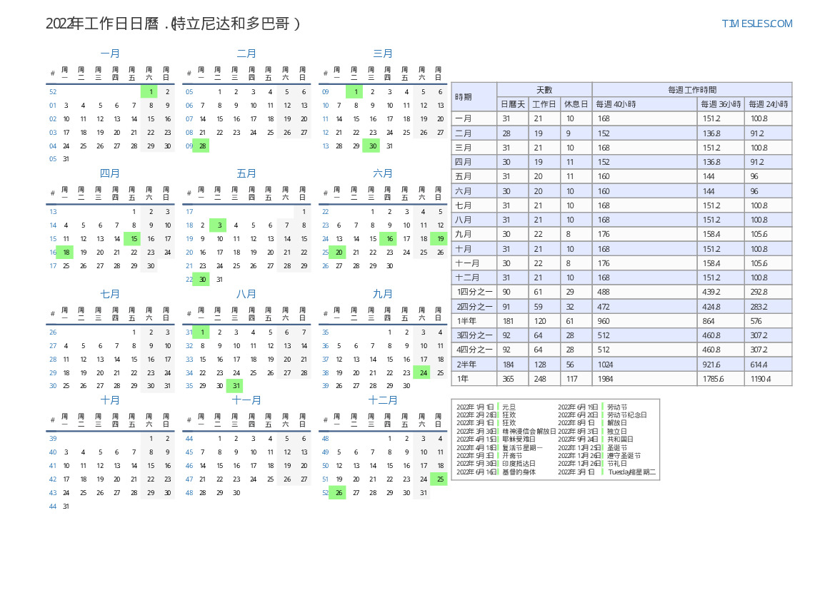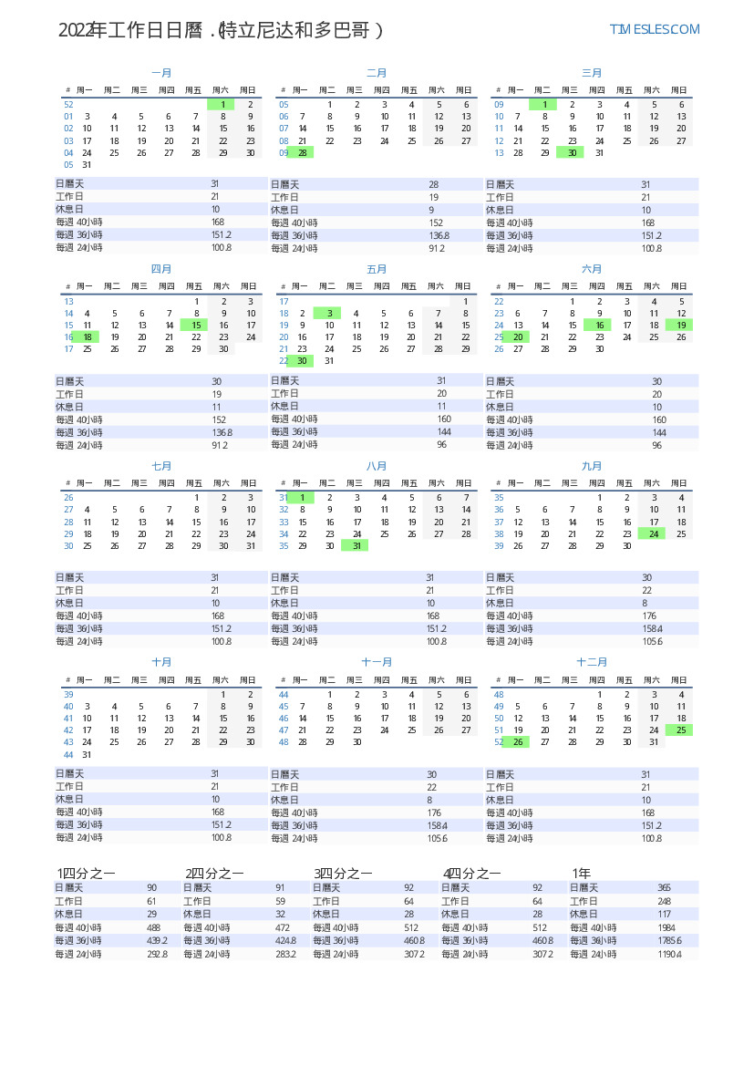 在特立尼达和多巴哥下載並打印2022年第1季度帶有假日和周末的PDF工作日日曆