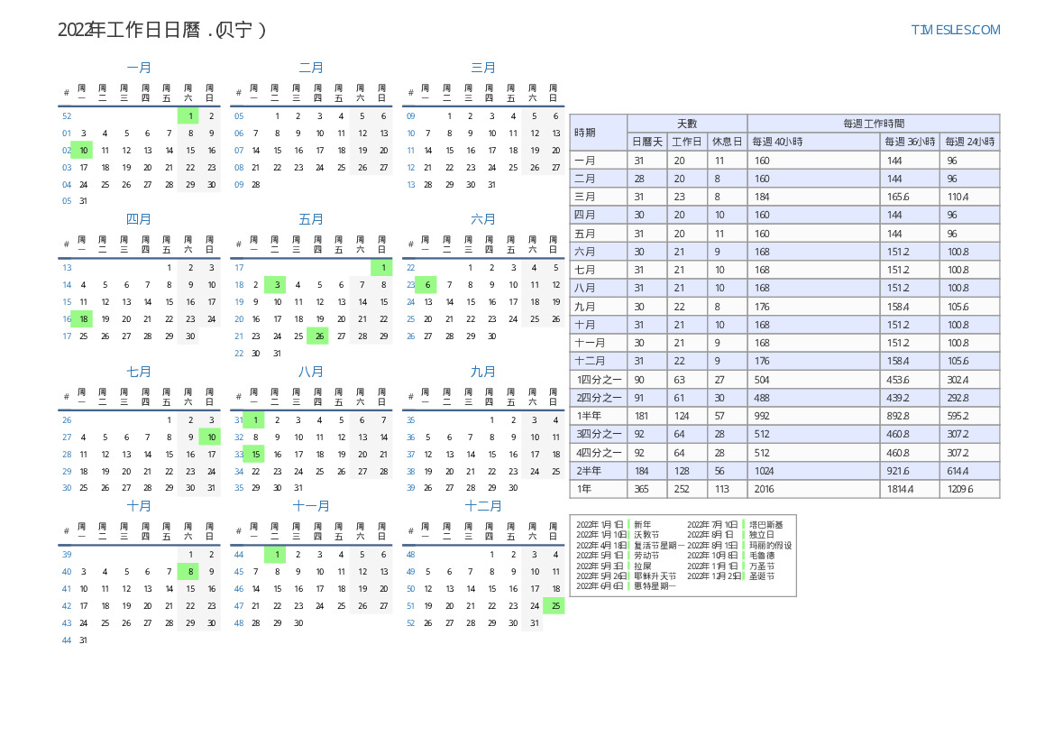 在贝宁下載並打印2022年第2季度帶有假日和周末的PDF工作日日曆