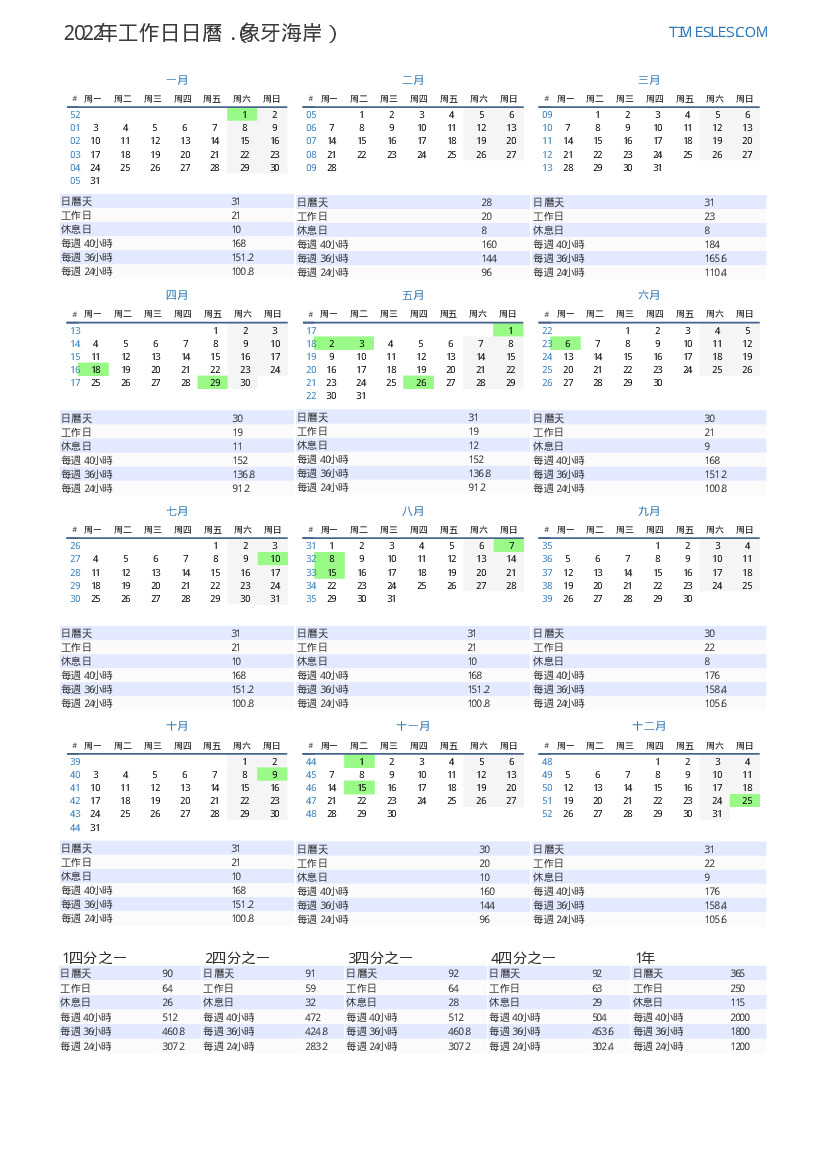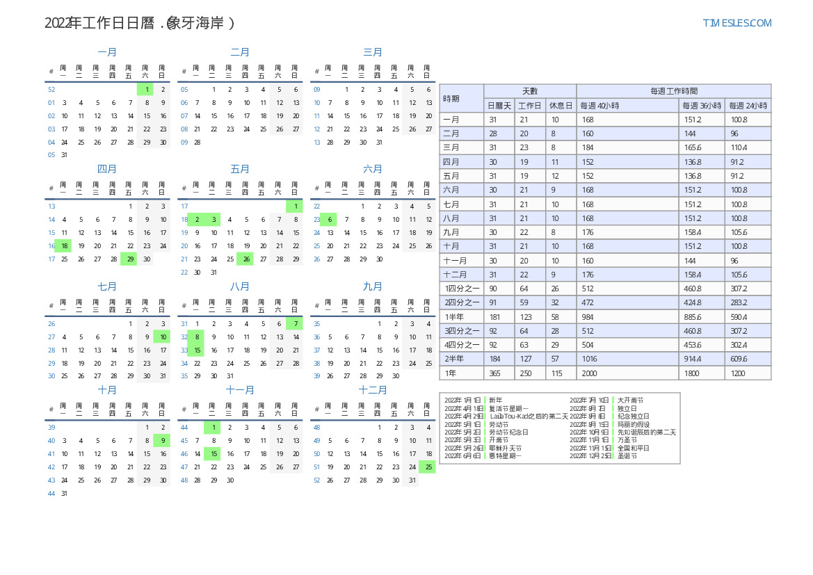 在科特迪瓦下載並打印2022年第4季度帶有假日和周末的PDF工作日日曆