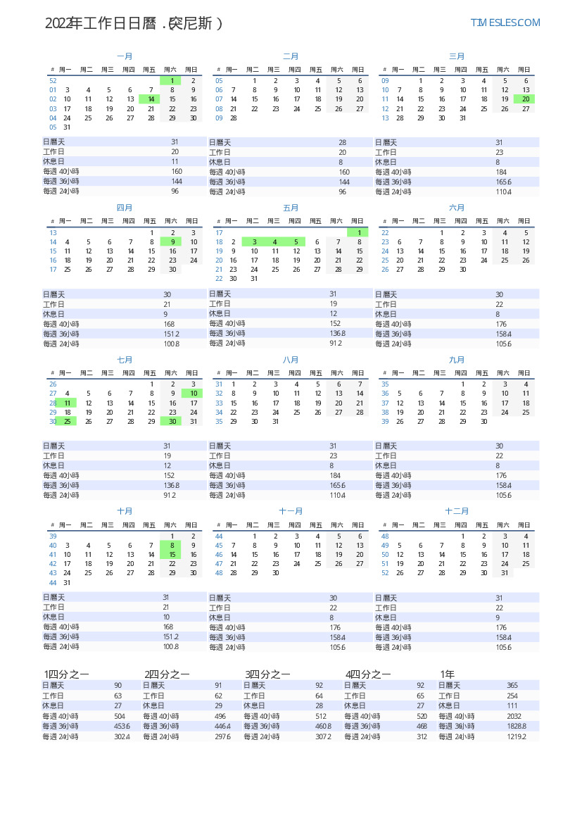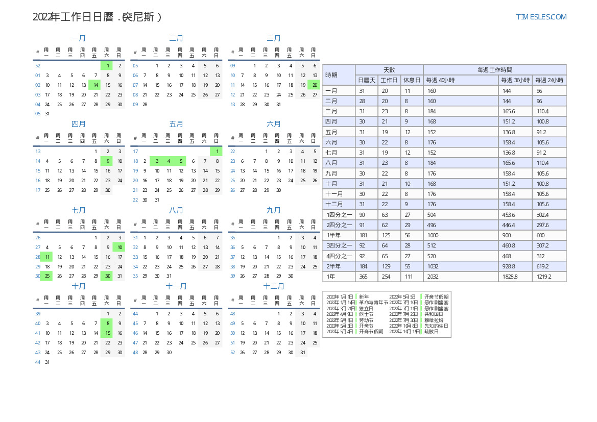 在突尼斯下載並打印2022年第4季度帶有假日和周末的PDF工作日日曆