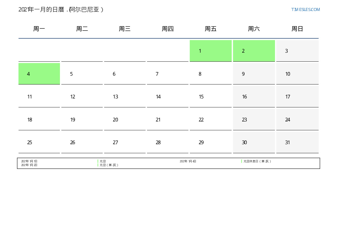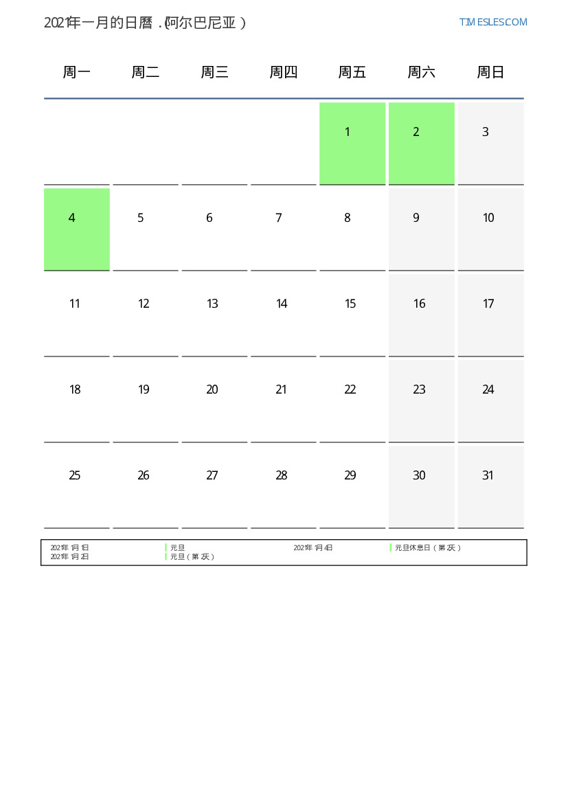 阿尔巴尼亚2021年一月的假期和周末日曆
