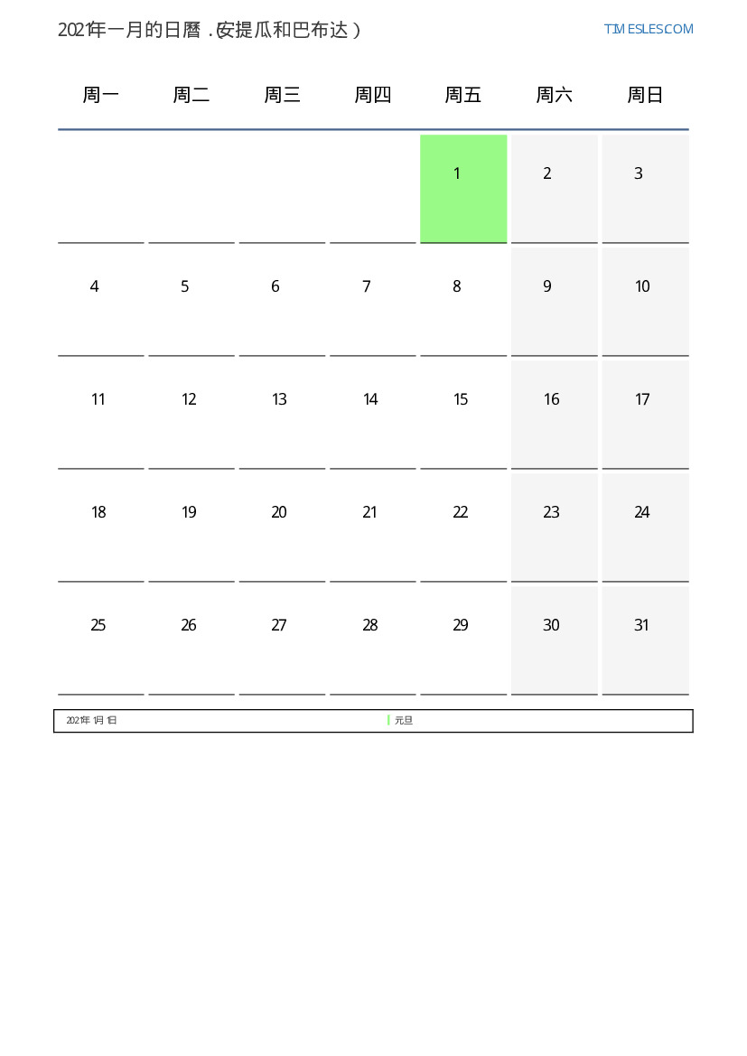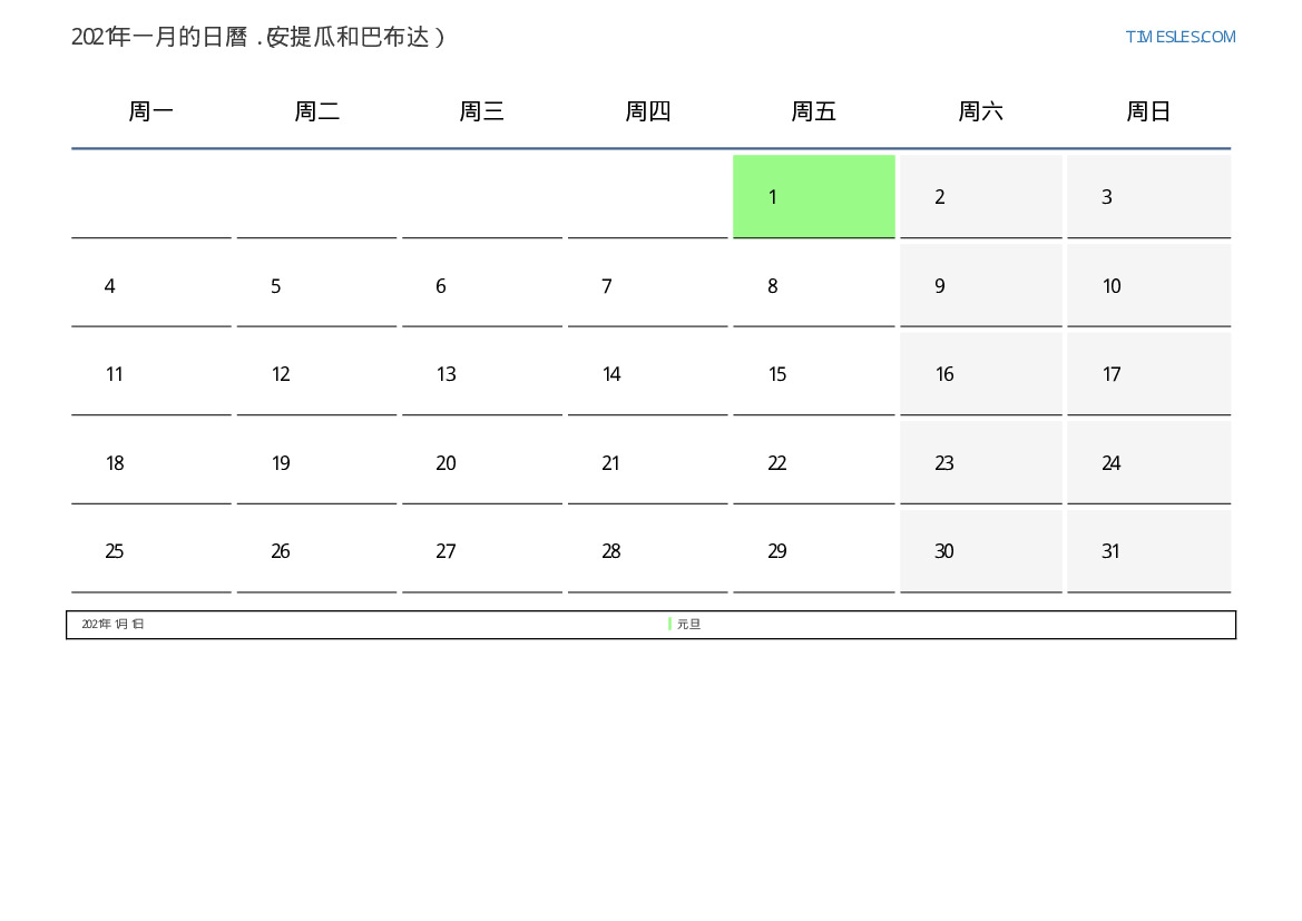 下載並打印2021年一月安提瓜和巴布达節假日和周末的PDF日曆