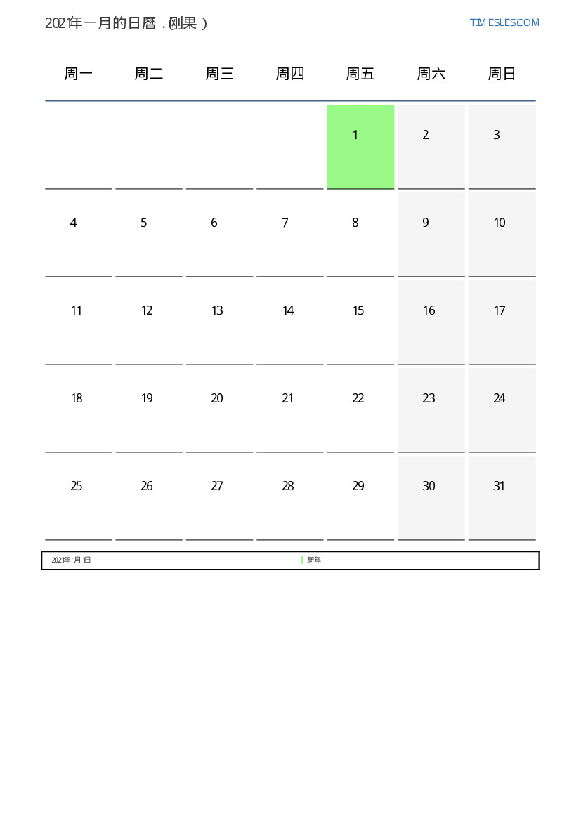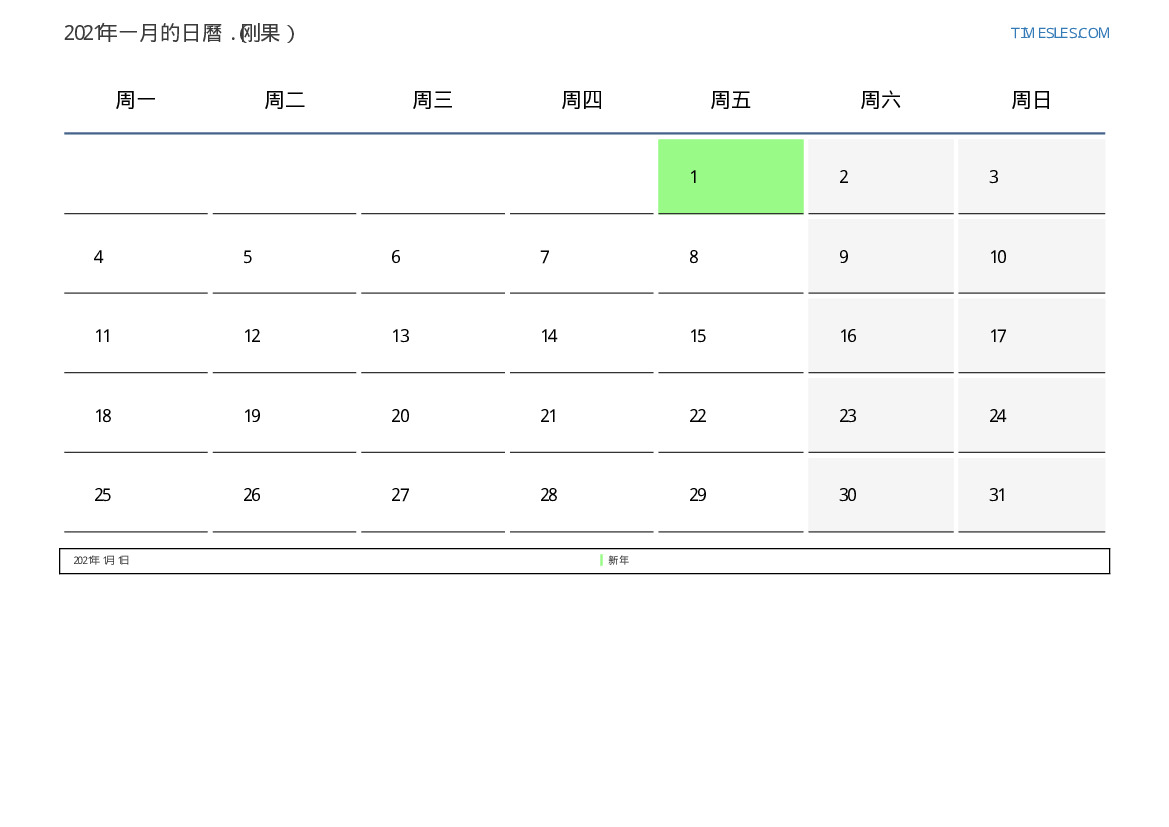 下載並打印2021年一月刚果節假日和周末的PDF日曆