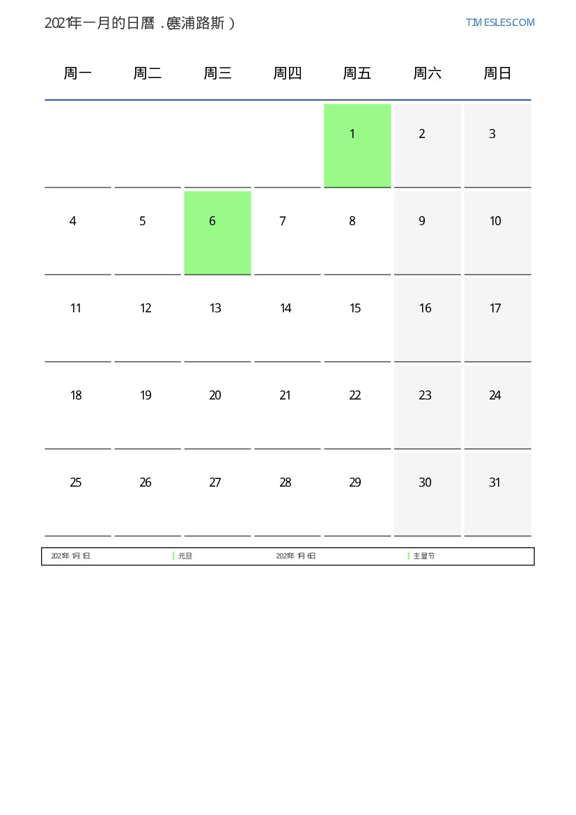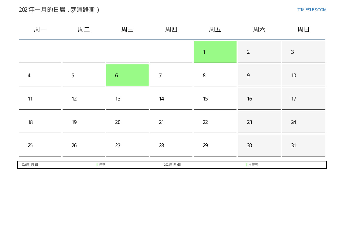 下載並打印2021年一月塞浦路斯節假日和周末的PDF日曆