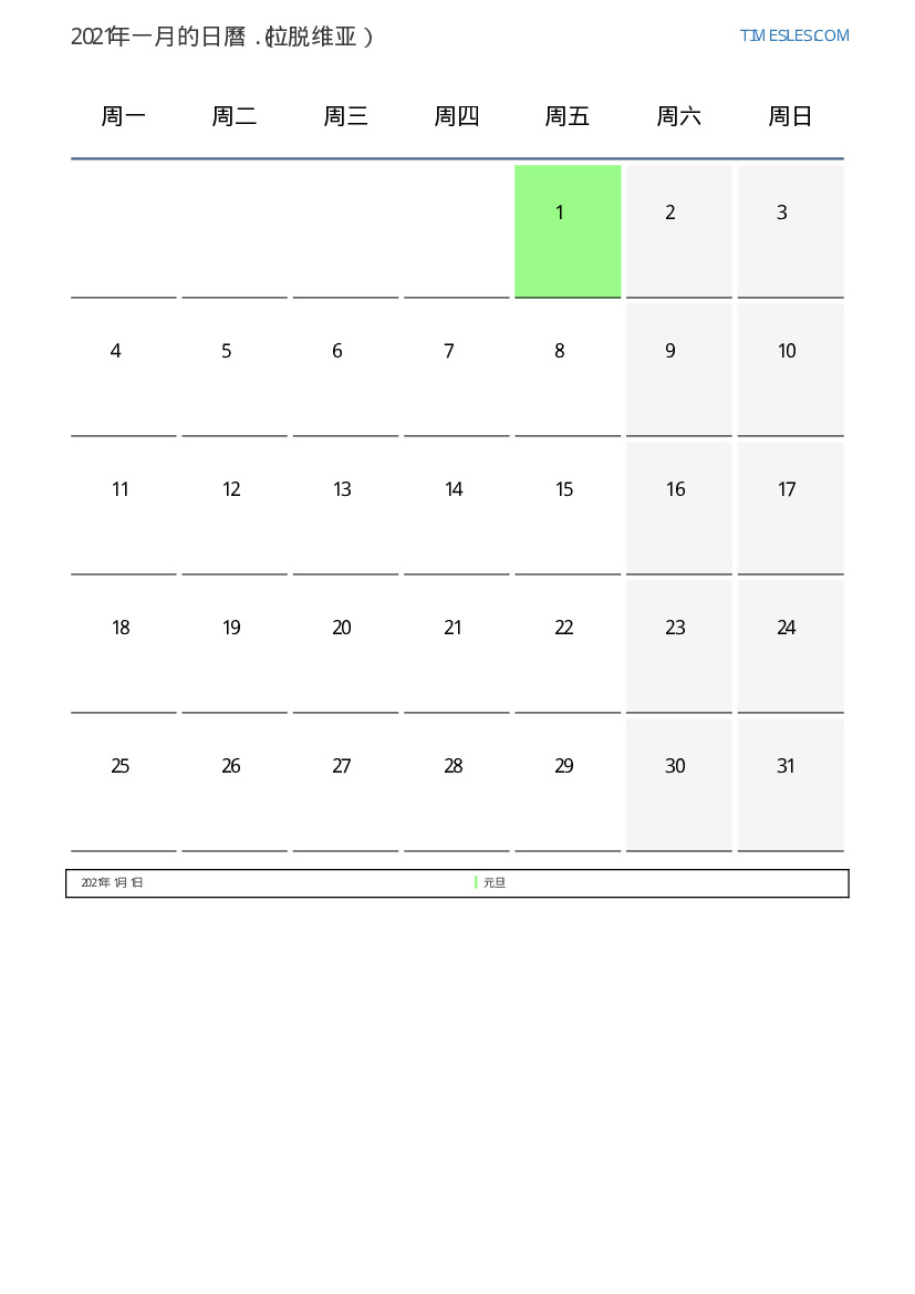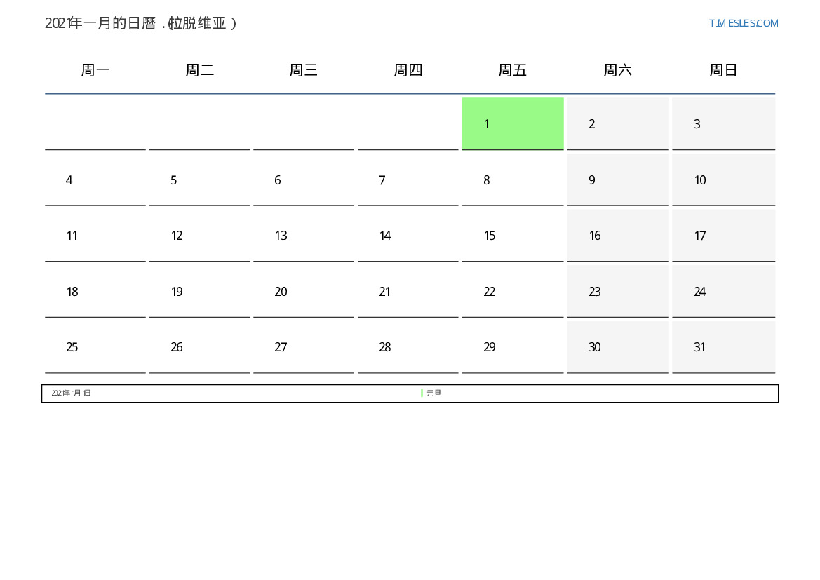 下載並打印2021年一月拉脱维亚節假日和周末的PDF日曆
