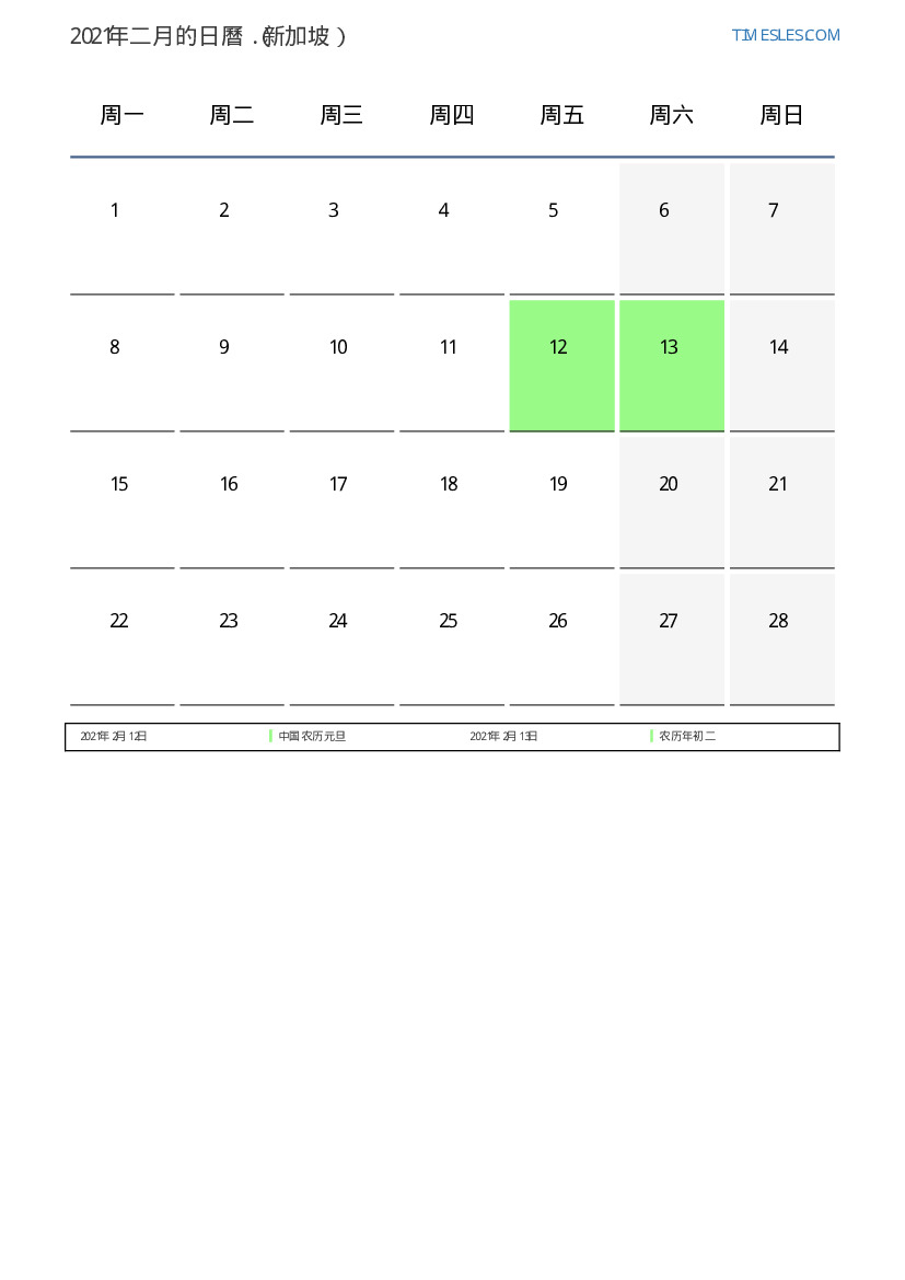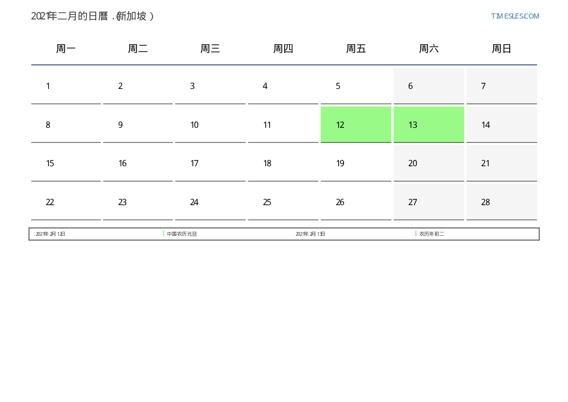 对于新加坡2021年二月的假期和周末日曆
