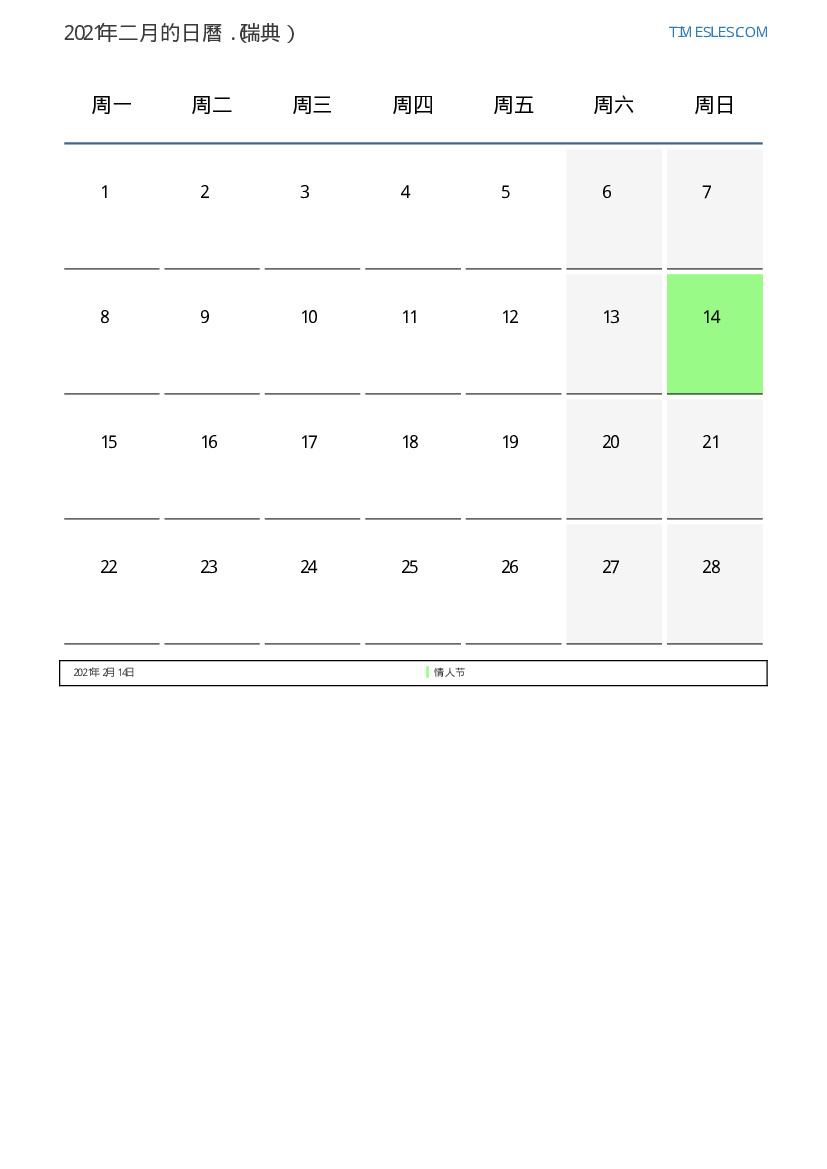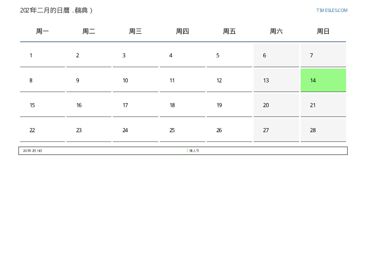 下載並打印2021年二月瑞典節假日和周末的PDF日曆