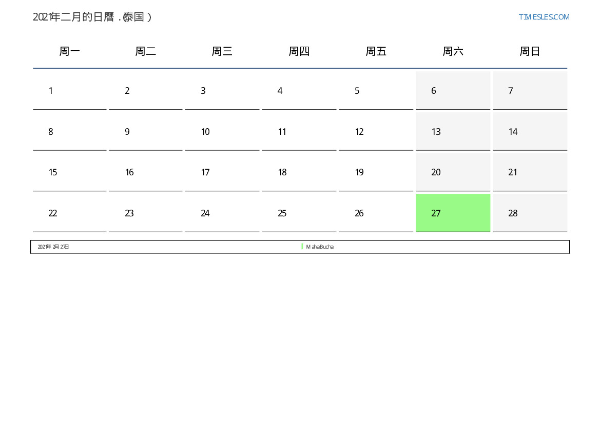下載並打印2021年二月为泰国節假日和周末的PDF日曆
