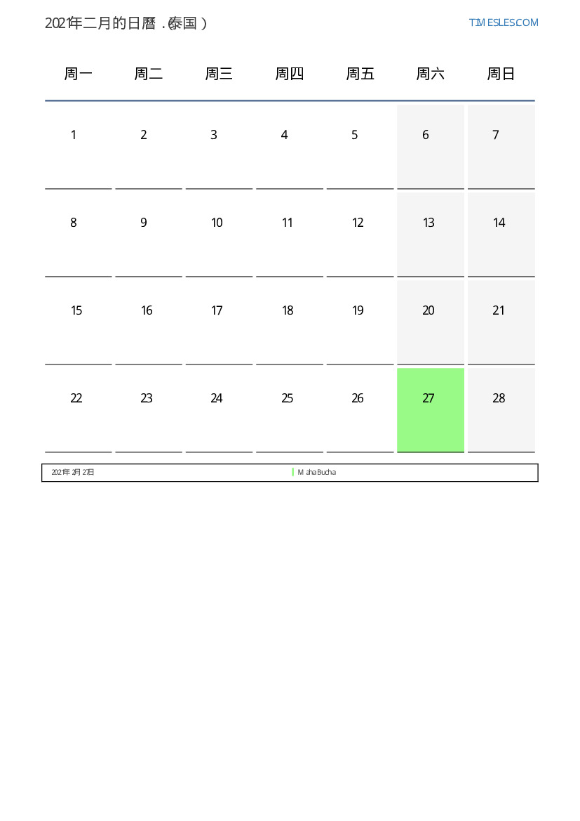 二月包含28天。 這是2021年的2個月。 在2021年二月,在泰国有5 假期和休假。