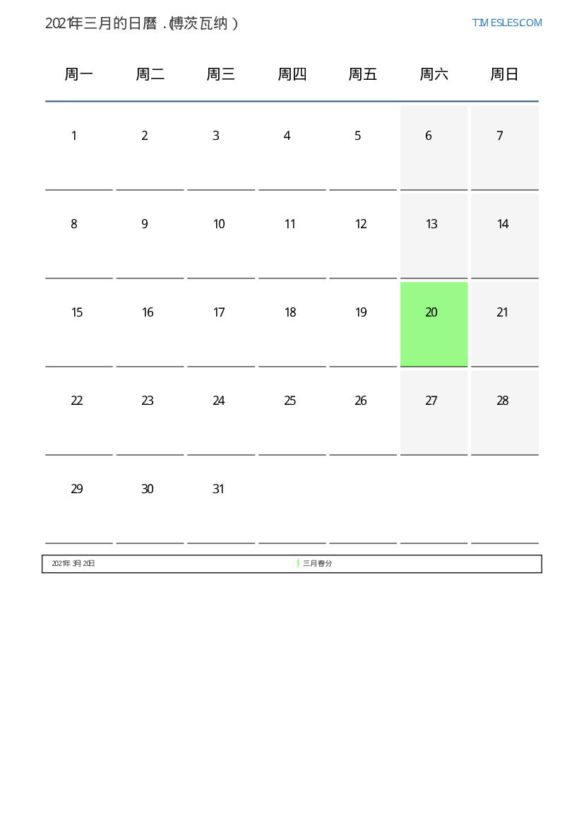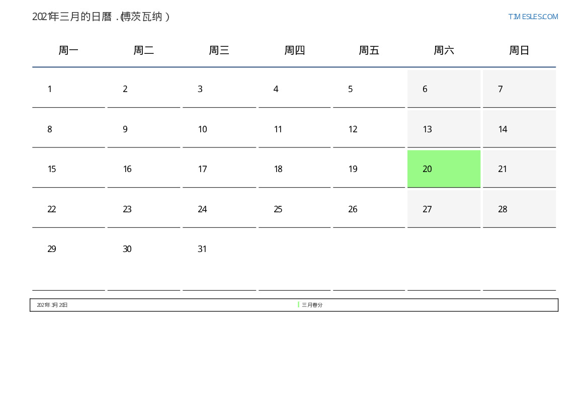 下載並打印2021年三月博茨瓦纳節假日和周末的PDF日曆