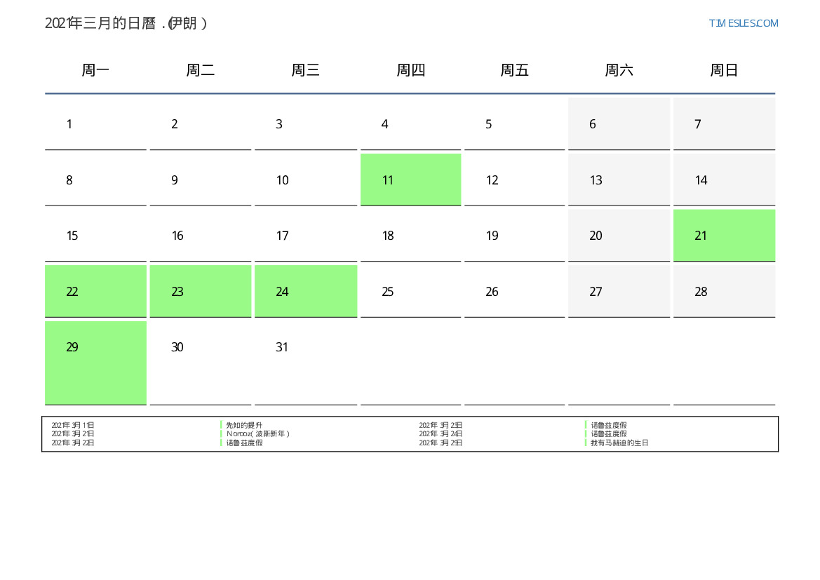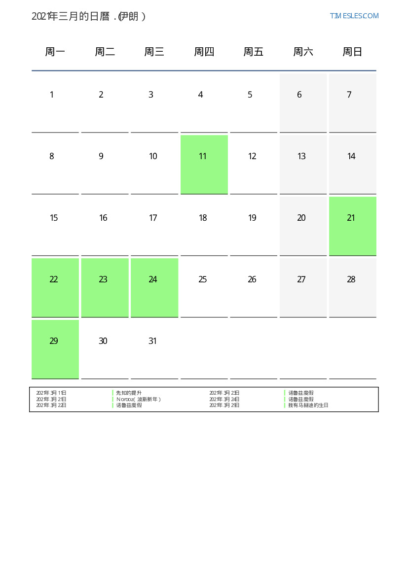下載並打印2021年三月伊朗節假日和周末的PDF日曆