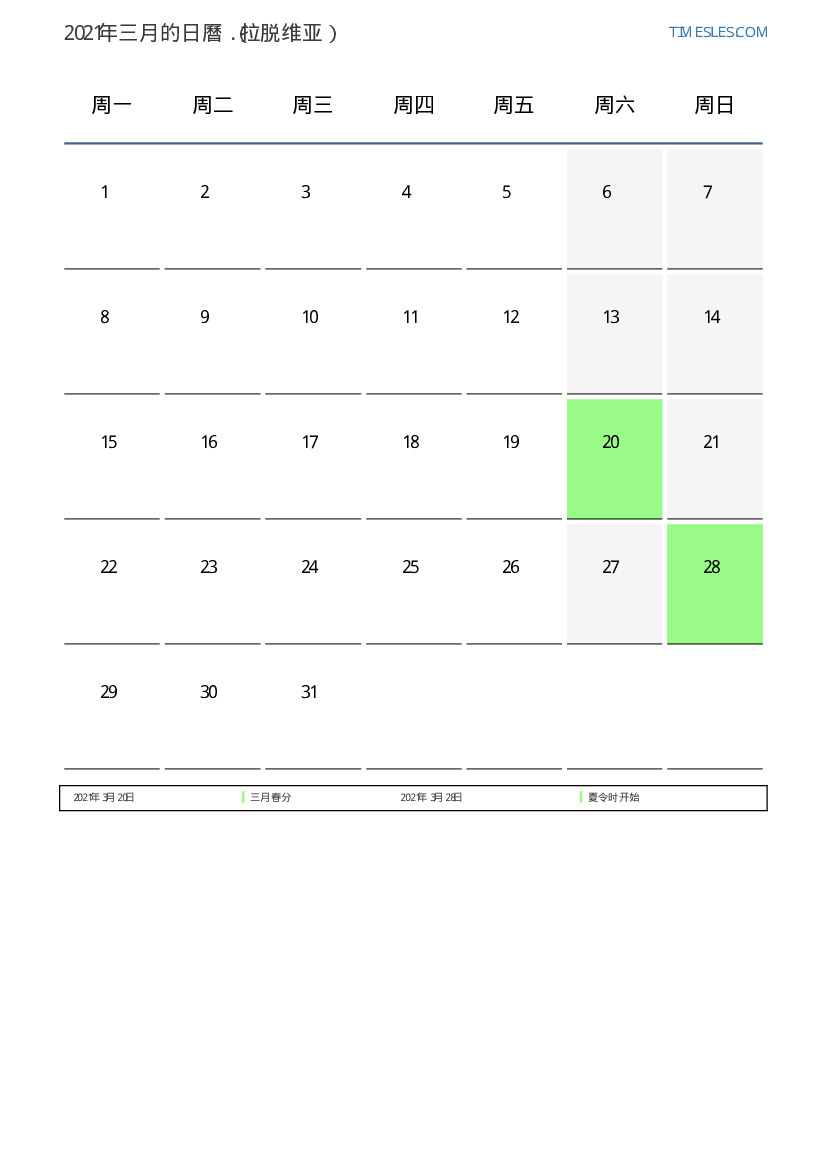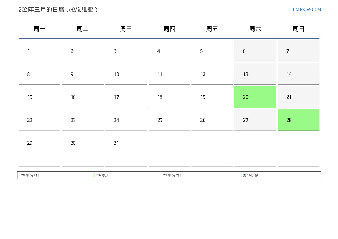 下載並打印2021年三月拉脱维亚節假日和周末的PDF日曆