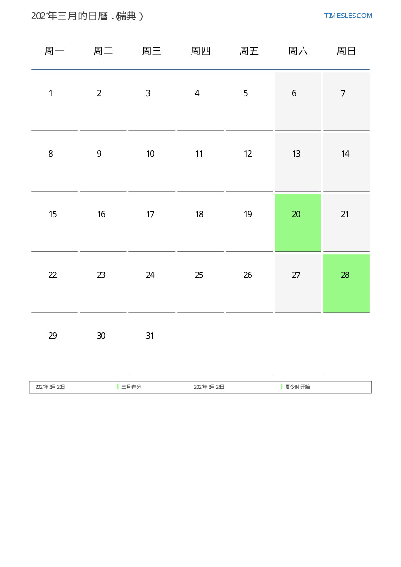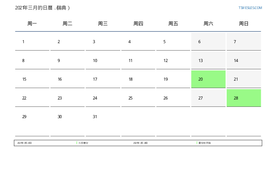 下載並打印2021年三月瑞典節假日和周末的PDF日曆