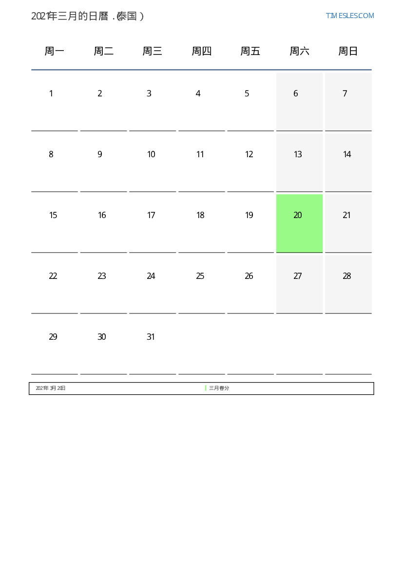 下載並打印2021年三月为泰国節假日和周末的PDF日曆