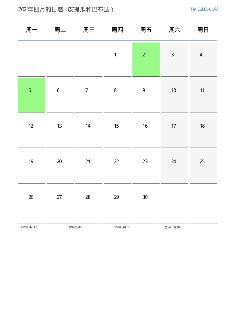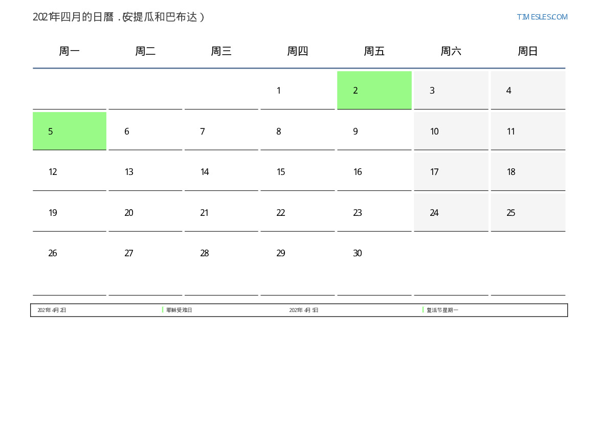 下載並打印2021年四月安提瓜和巴布达節假日和周末的PDF日曆