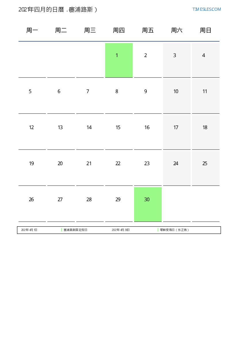 下載並打印2021年四月塞浦路斯節假日和周末的PDF日曆