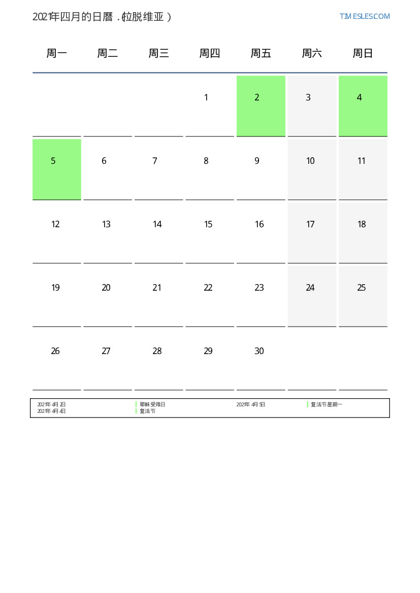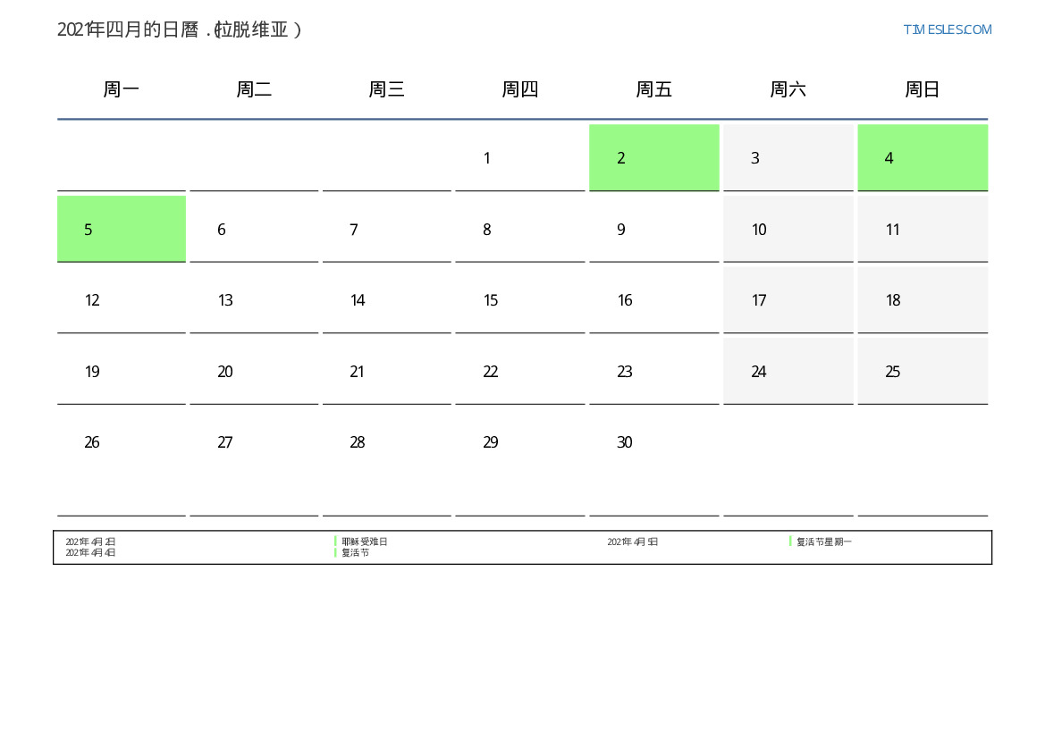下載並打印2021年四月拉脱维亚節假日和周末的PDF日曆
