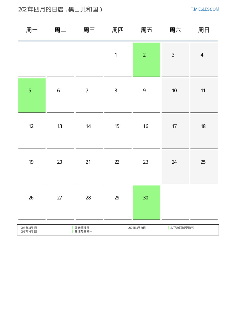 下載並打印2021年四月黑山共和国節假日和周末的PDF日曆