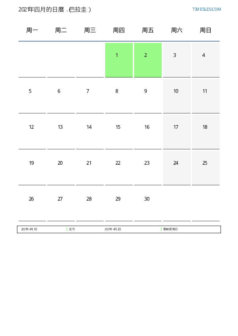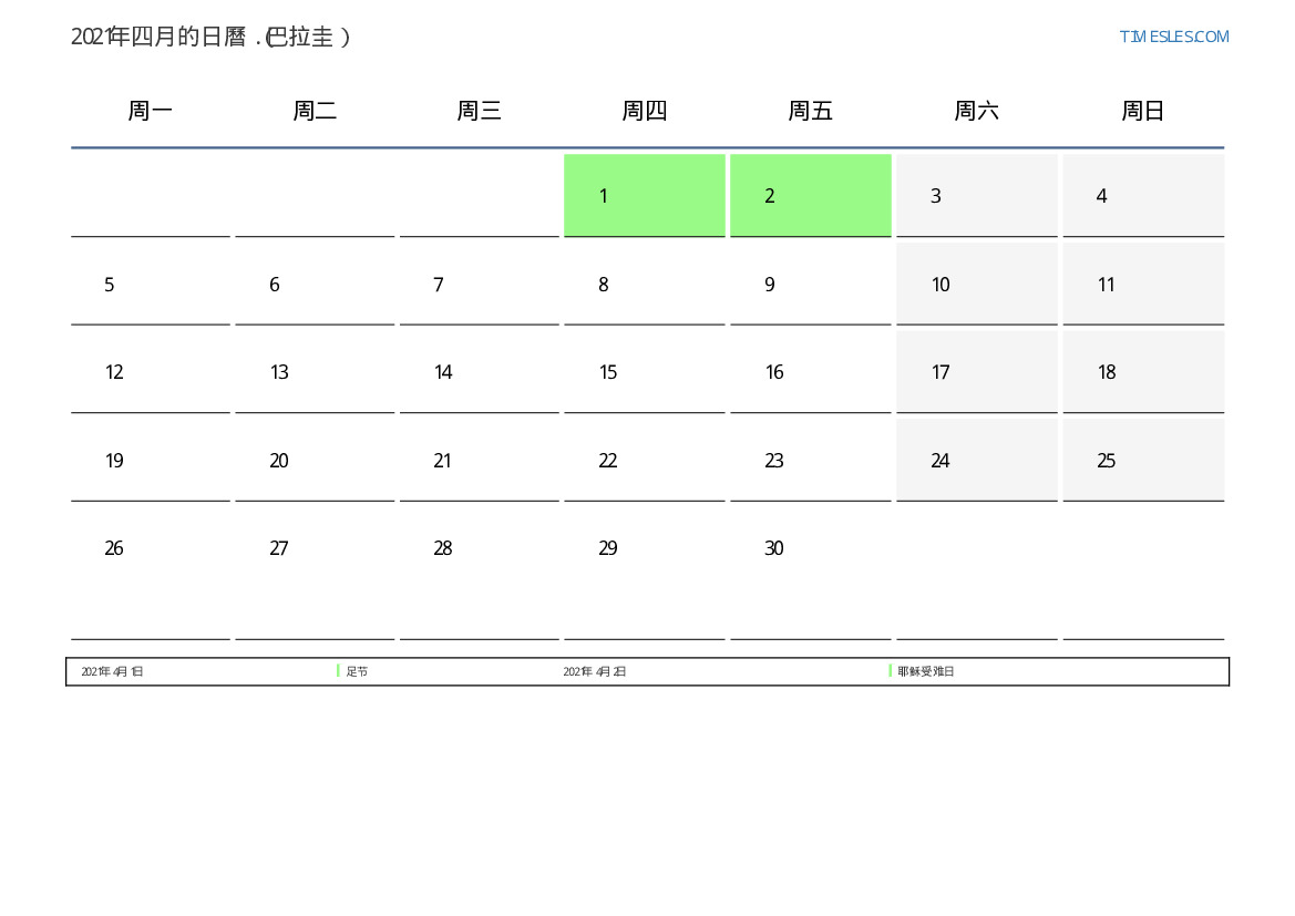 下載並打印2021年四月巴拉圭節假日和周末的PDF日曆