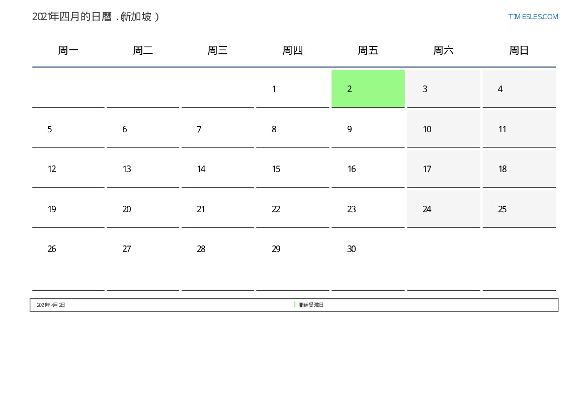下載並打印2021年四月对于新加坡節假日和周末的PDF日曆