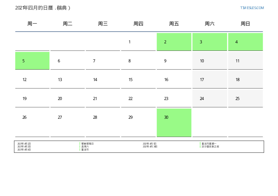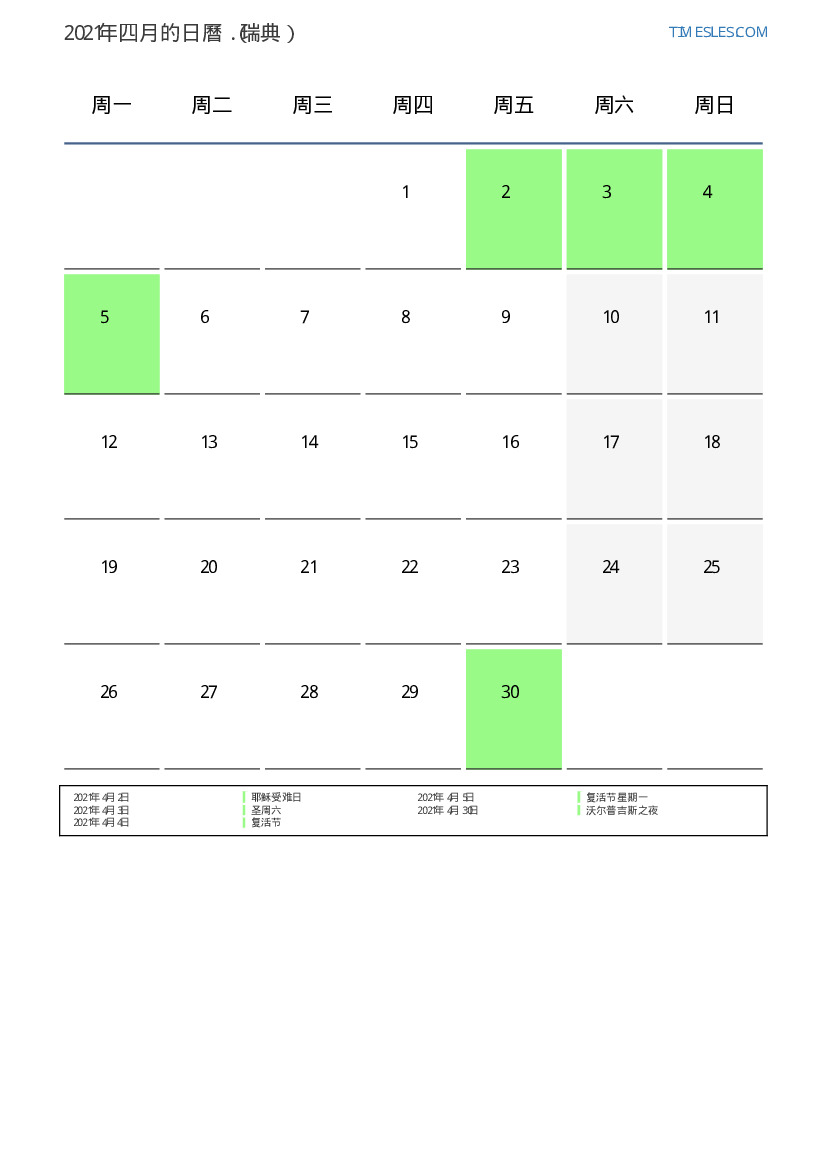 下載並打印2021年四月瑞典節假日和周末的PDF日曆