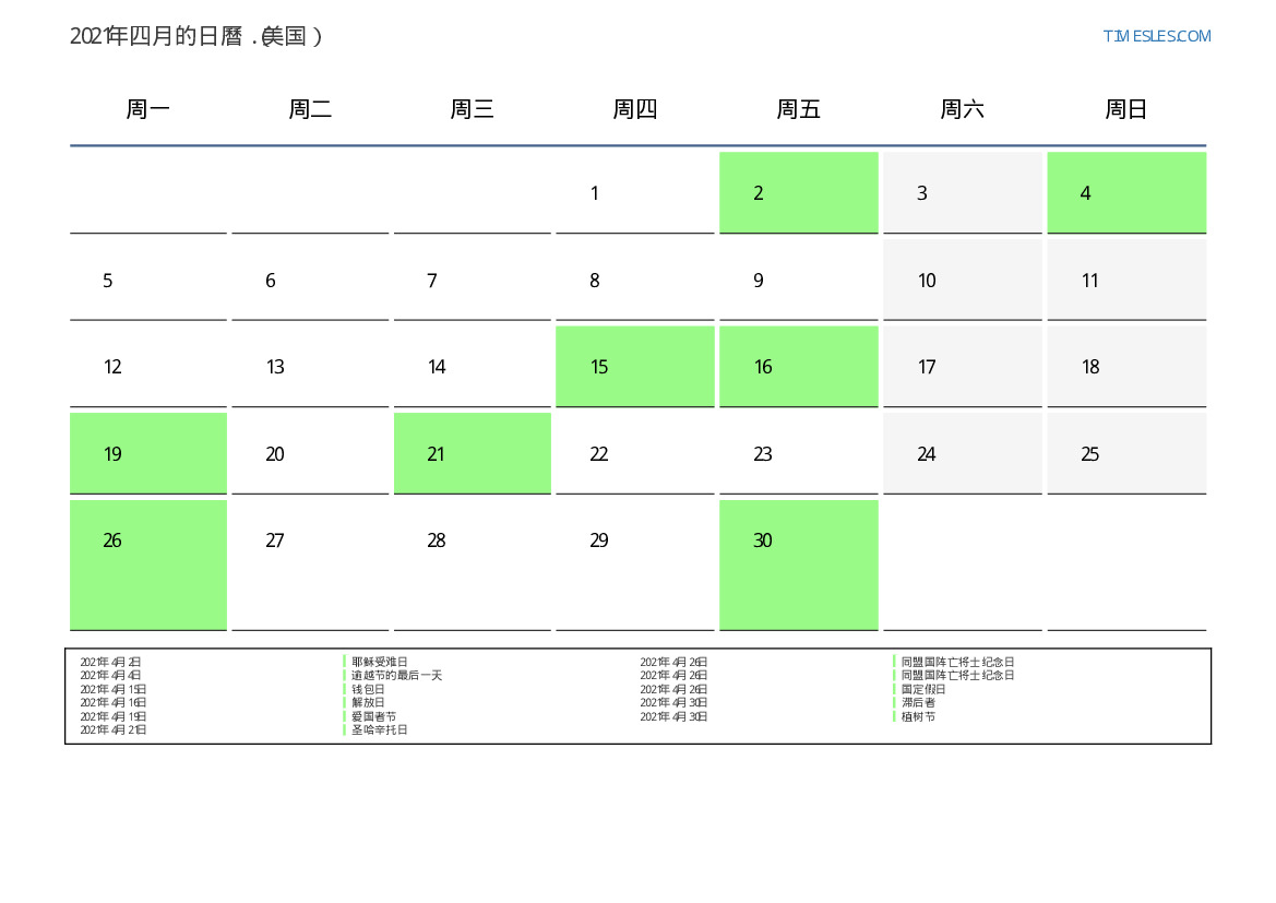 美国2021年四月的假期和周末日曆