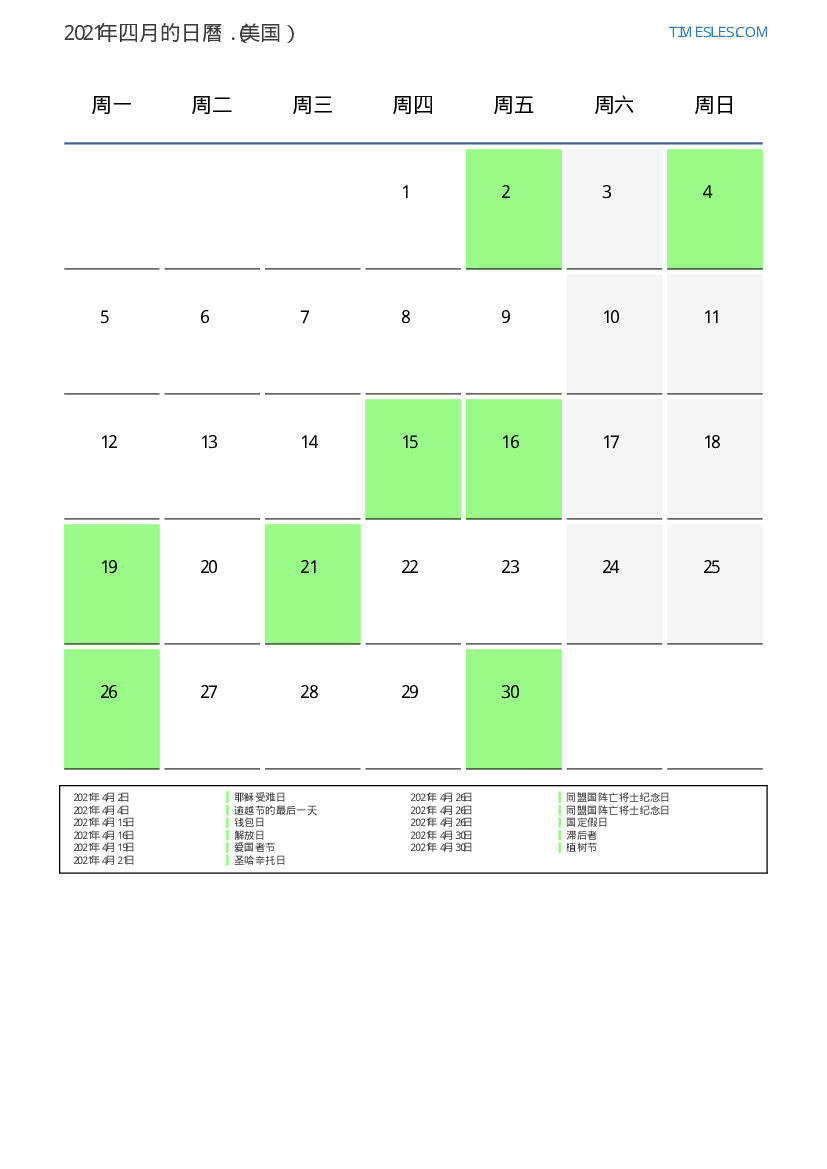 下載並打印2021年四月美国節假日和周末的PDF日曆
