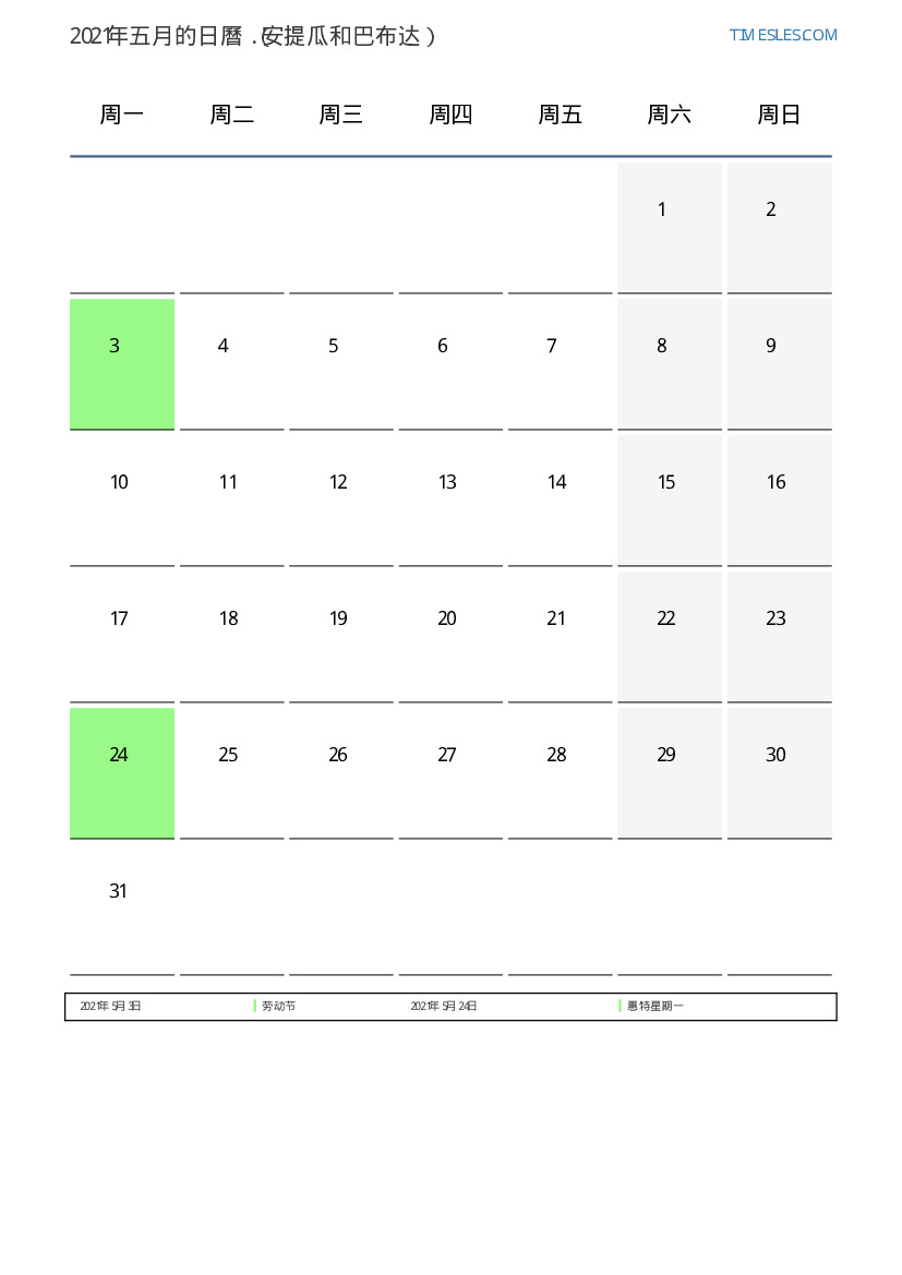 下載並打印2021年五月安提瓜和巴布达節假日和周末的PDF日曆