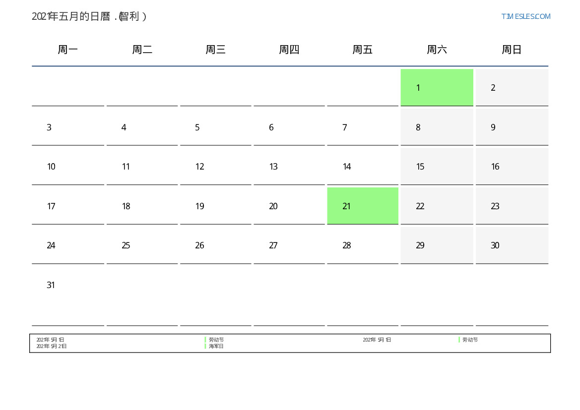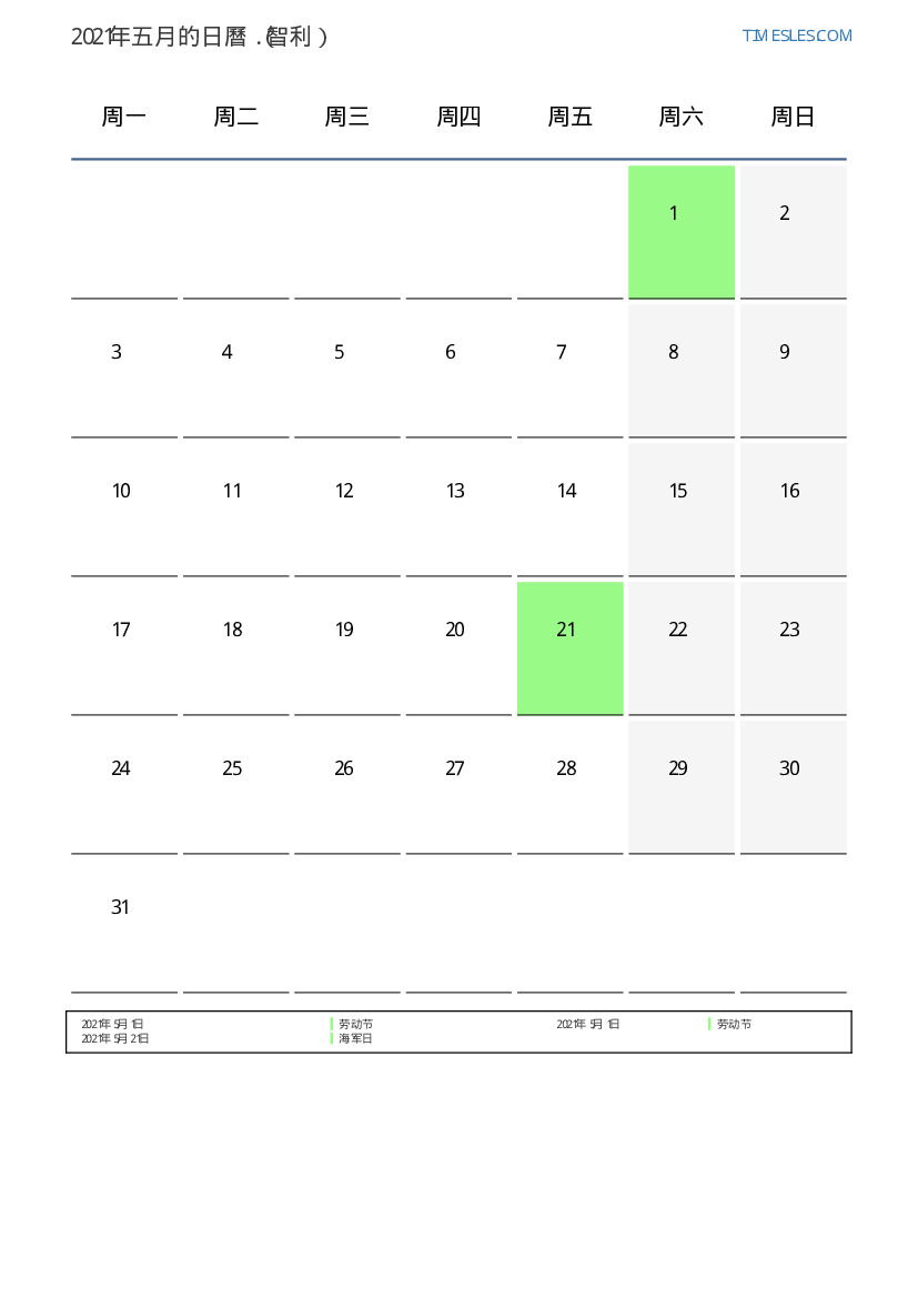 下載並打印2021年五月智利節假日和周末的PDF日曆