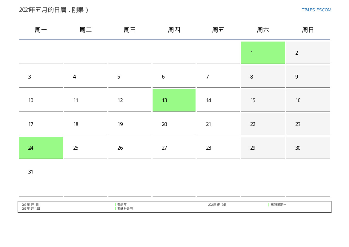 下載並打印2021年五月刚果節假日和周末的PDF日曆