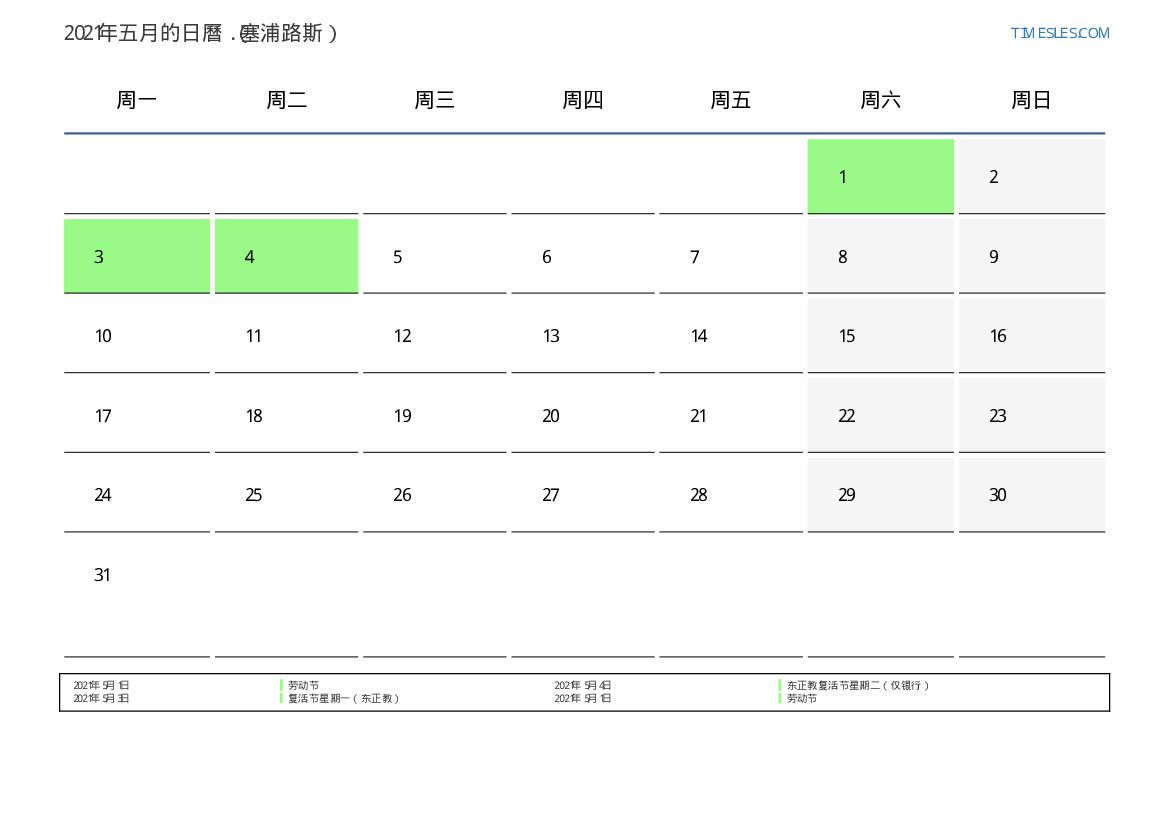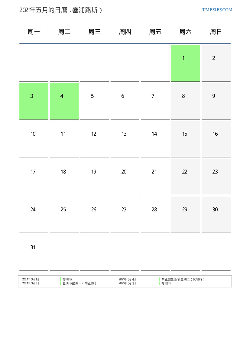 下載並打印2021年五月塞浦路斯節假日和周末的PDF日曆