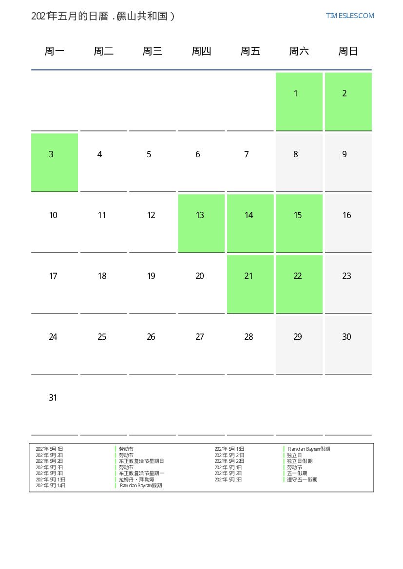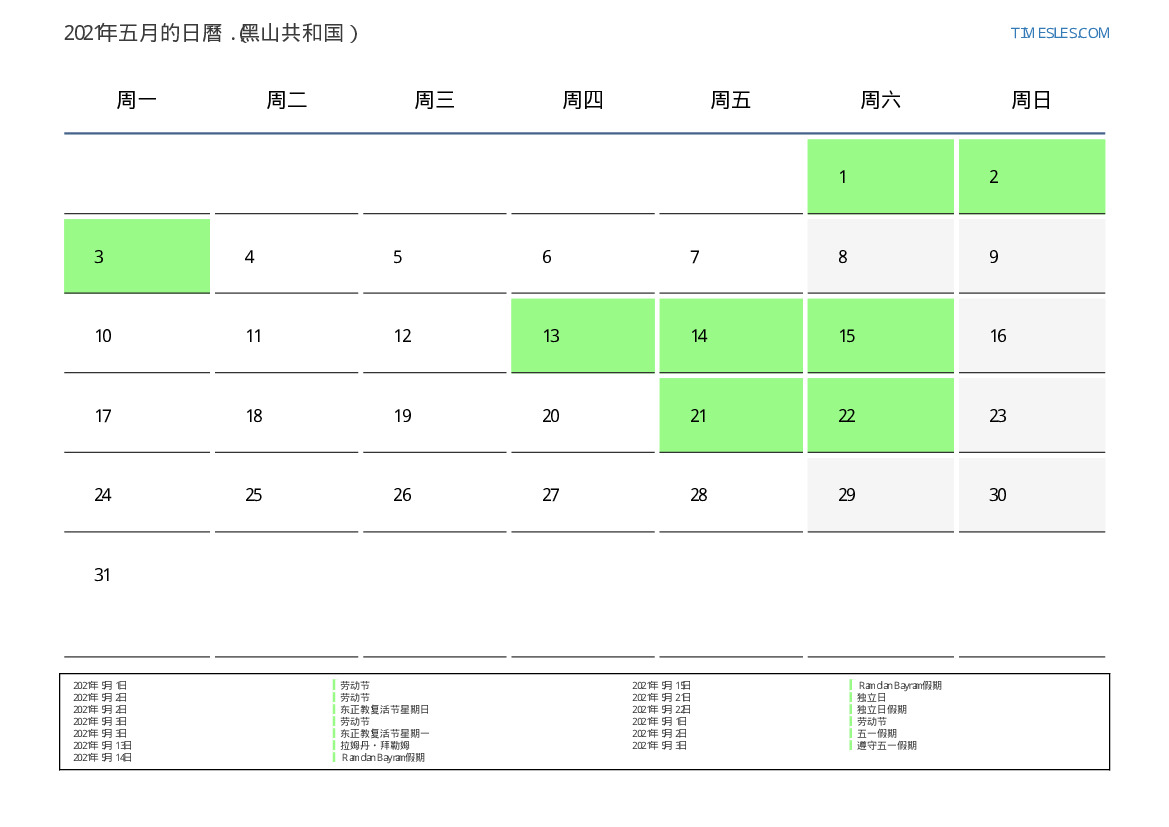 黑山共和国2021年五月日曆