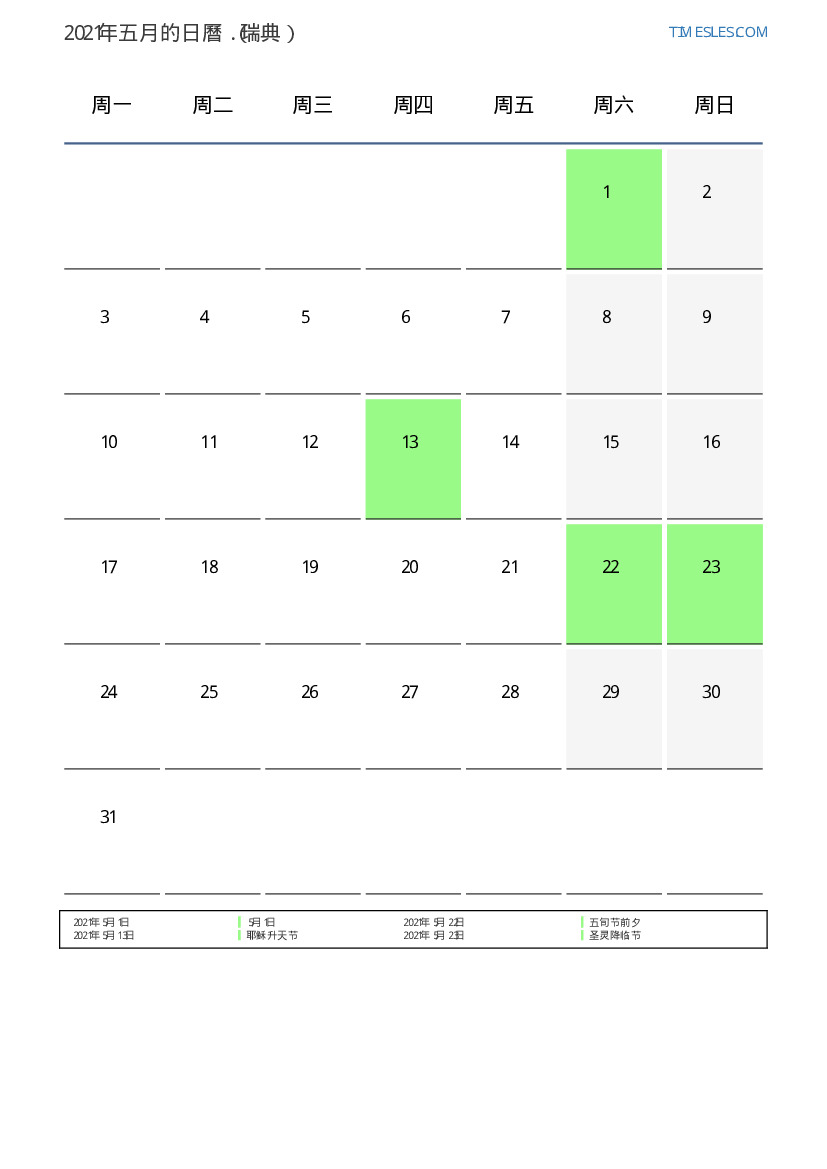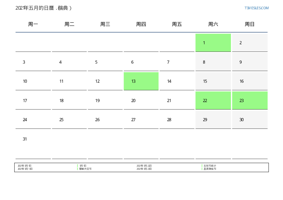 下載並打印2021年五月瑞典節假日和周末的PDF日曆
