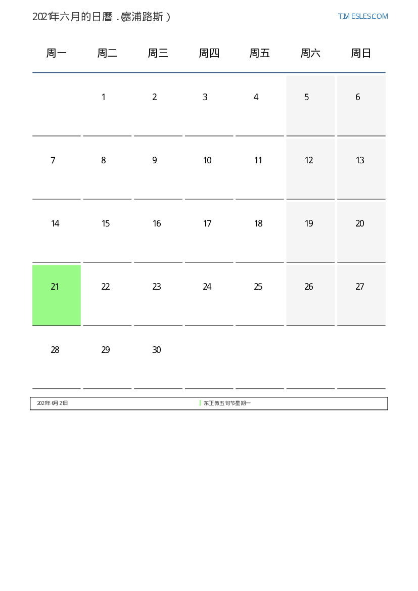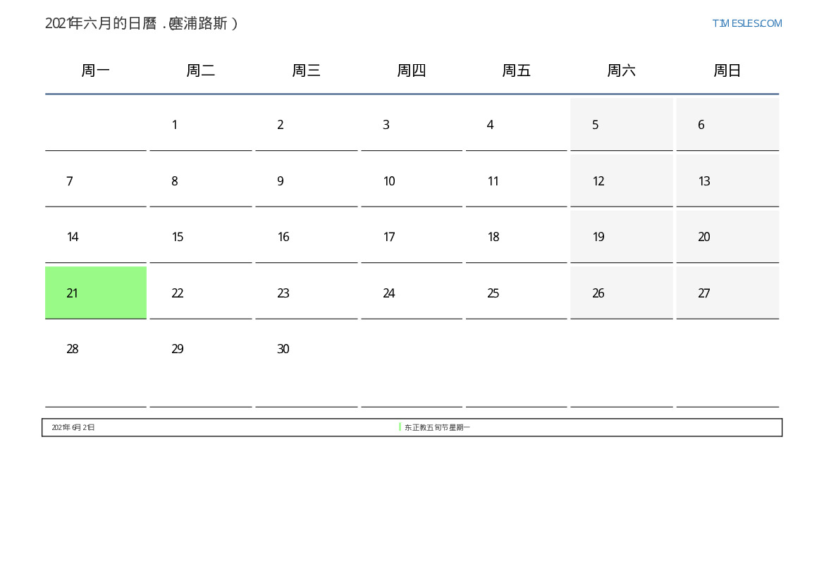 下載並打印2021年六月塞浦路斯節假日和周末的PDF日曆