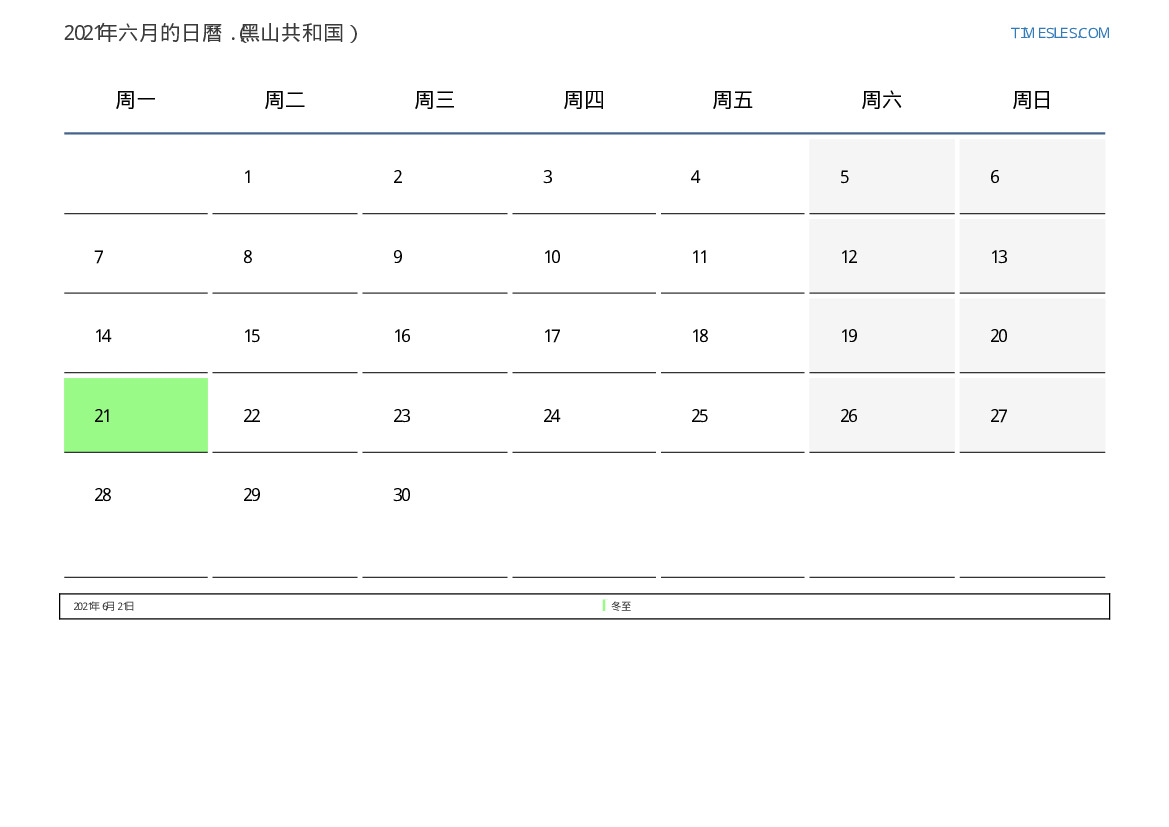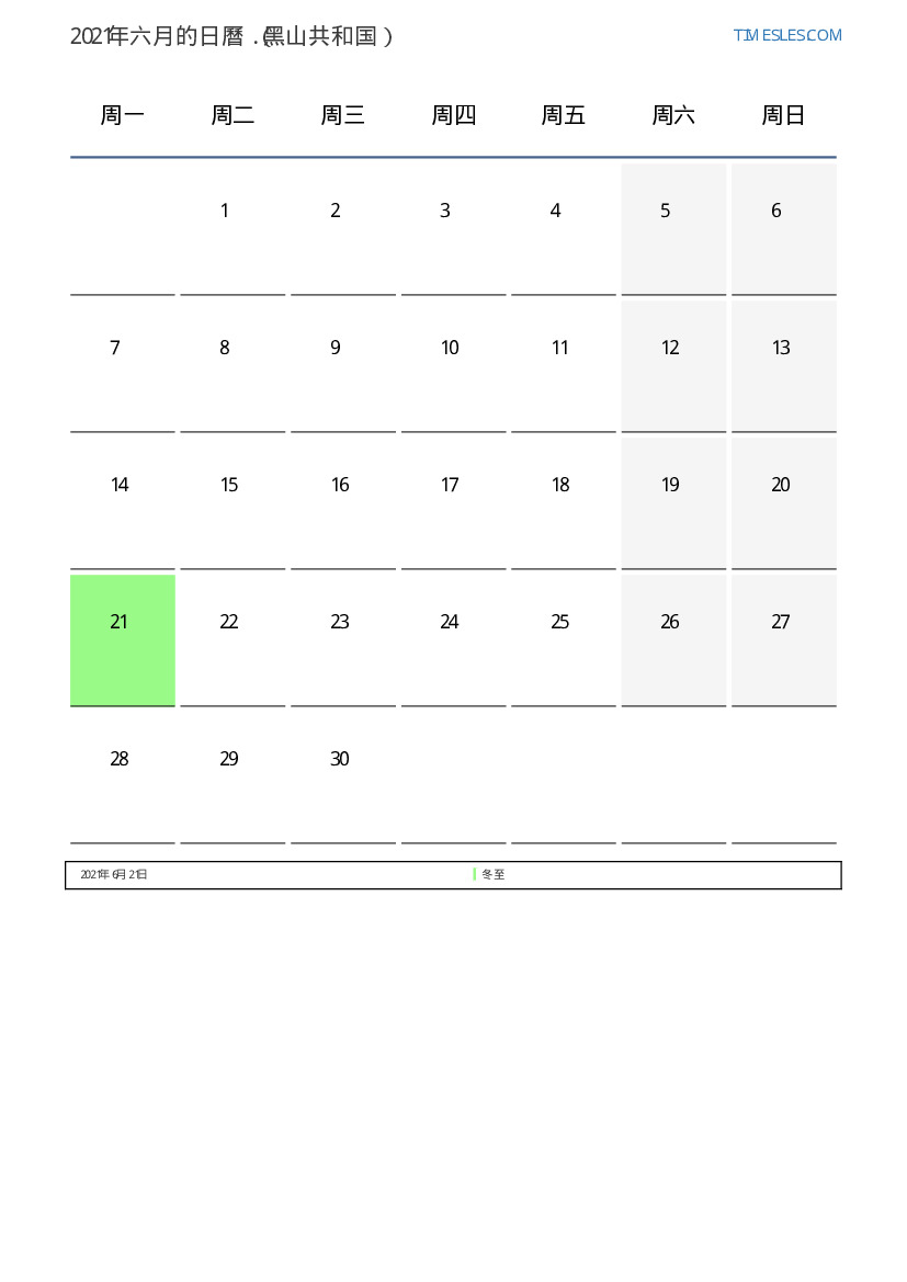 下載並打印2021年六月黑山共和国節假日和周末的PDF日曆