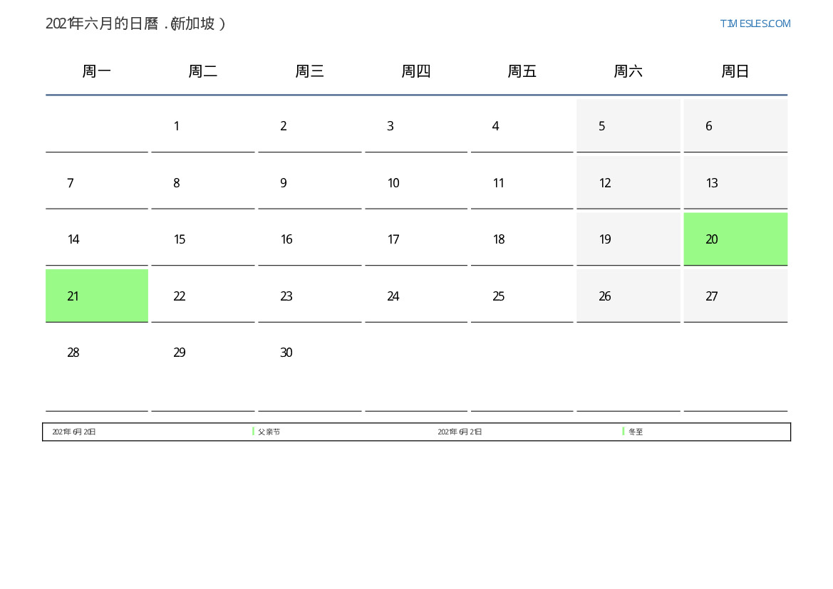 六月包含30天。 這是2021年的6個月。 在2021年六月,在新加坡有2 假期和休假。