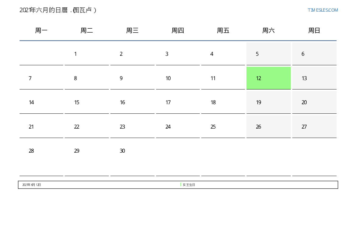六月包含30天。 這是2021年的6個月。 在2021年六月,在图瓦卢有2 假期和休假。