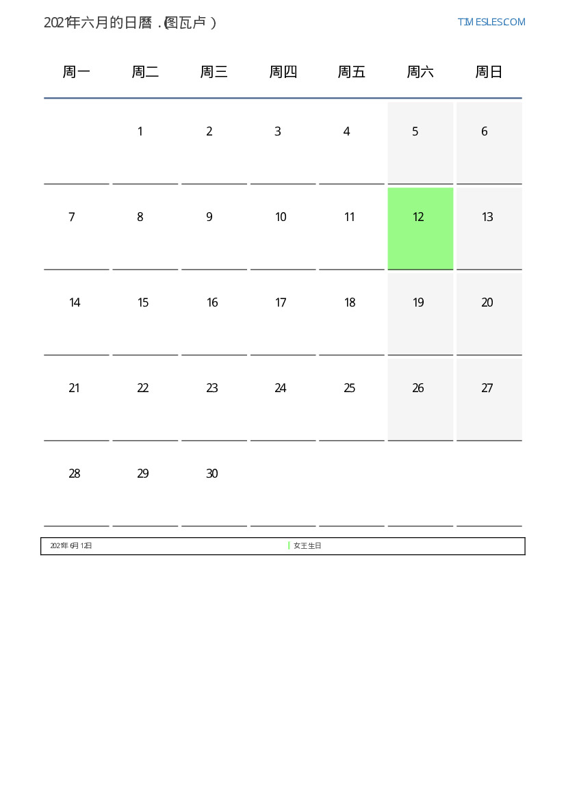下載並打印2021年六月对于图瓦卢節假日和周末的PDF日曆