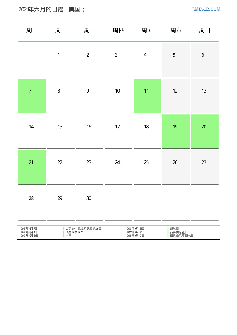 下載並打印2021年六月美国節假日和周末的PDF日曆
