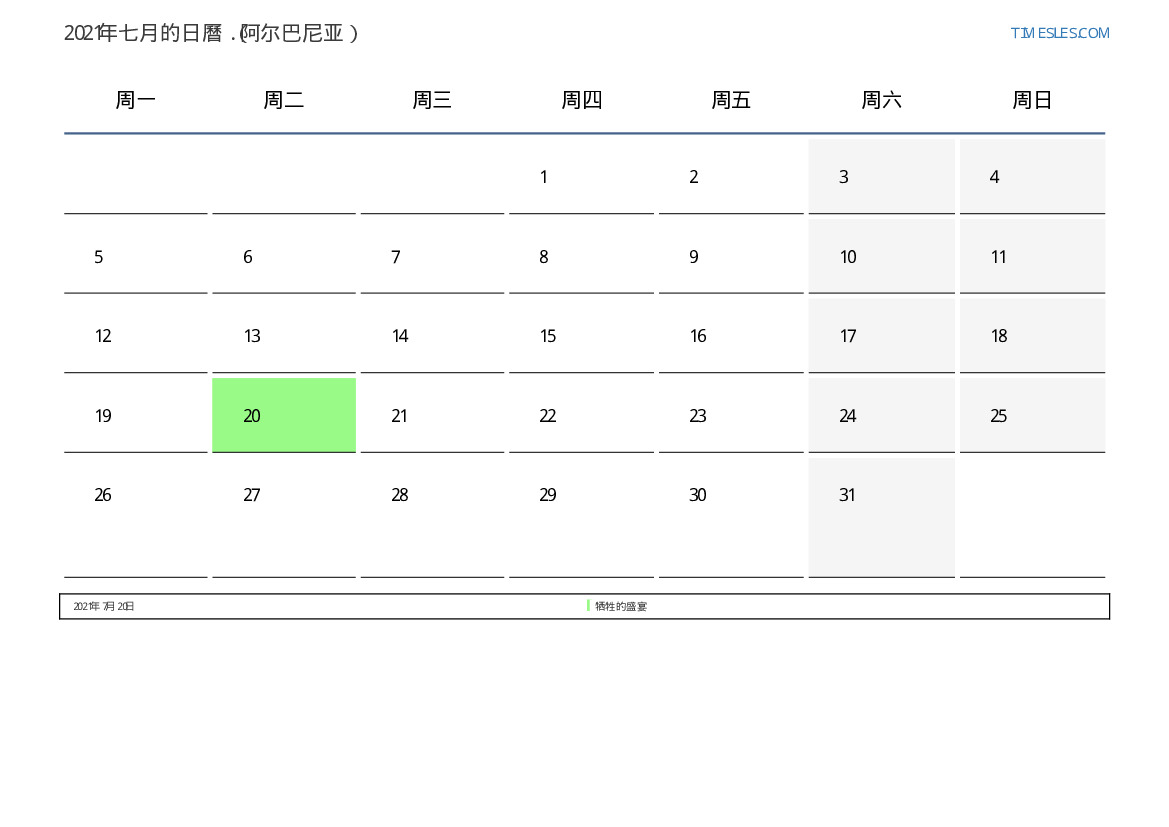 下載並打印2021年七月阿尔巴尼亚節假日和周末的PDF日曆