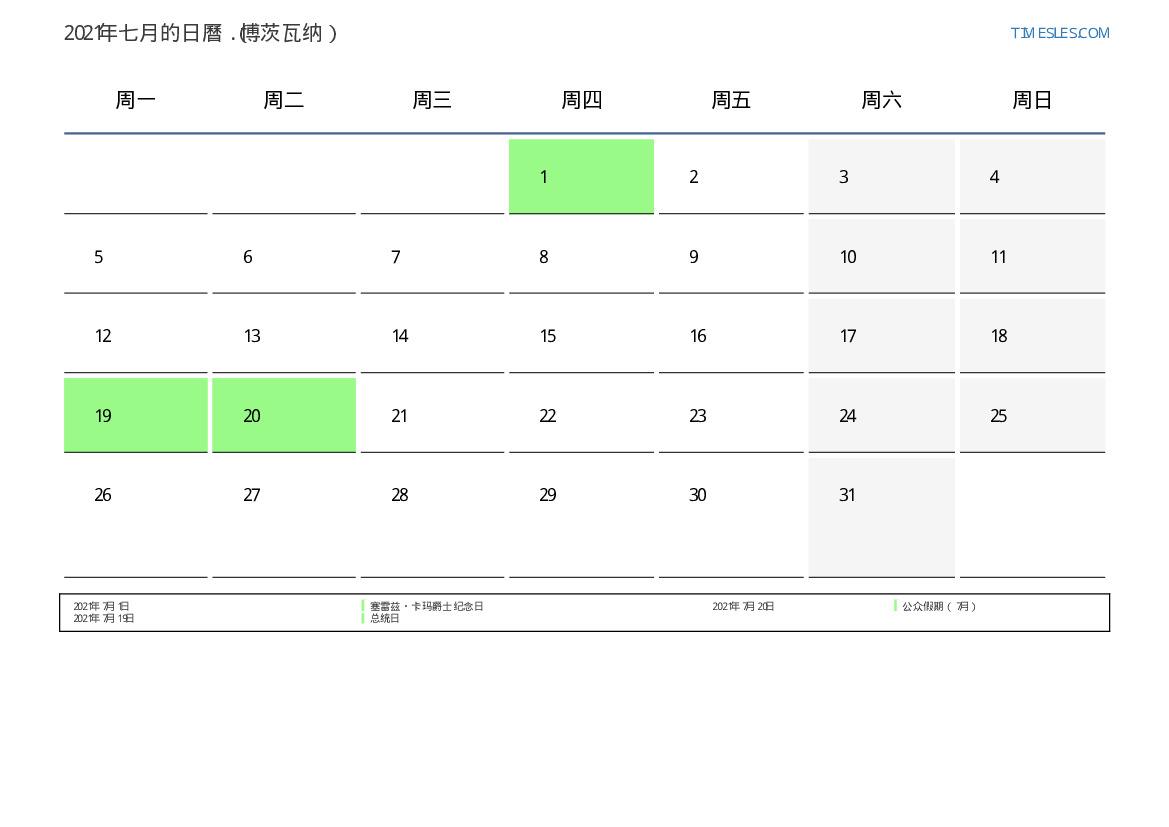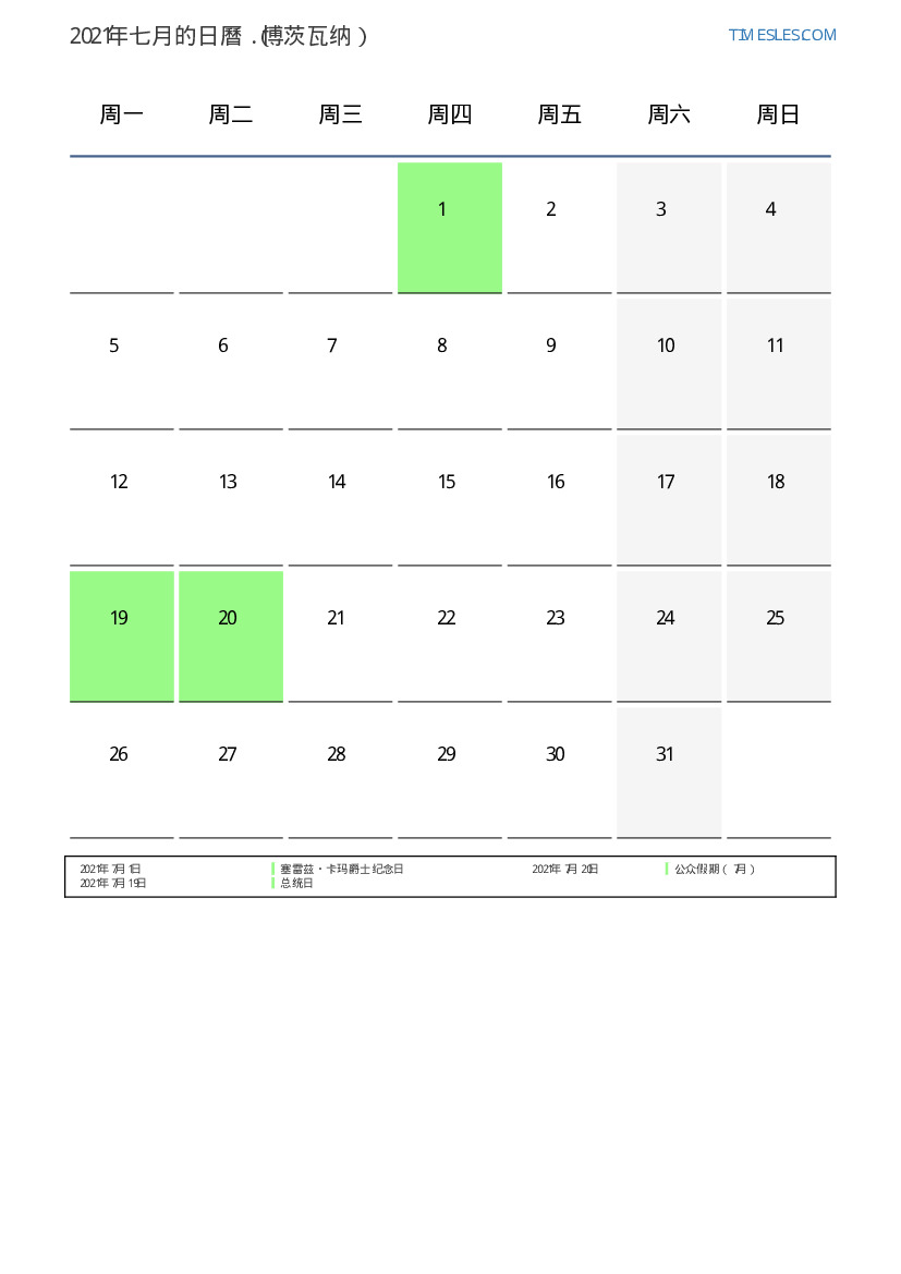 下載並打印2021年七月博茨瓦纳節假日和周末的PDF日曆