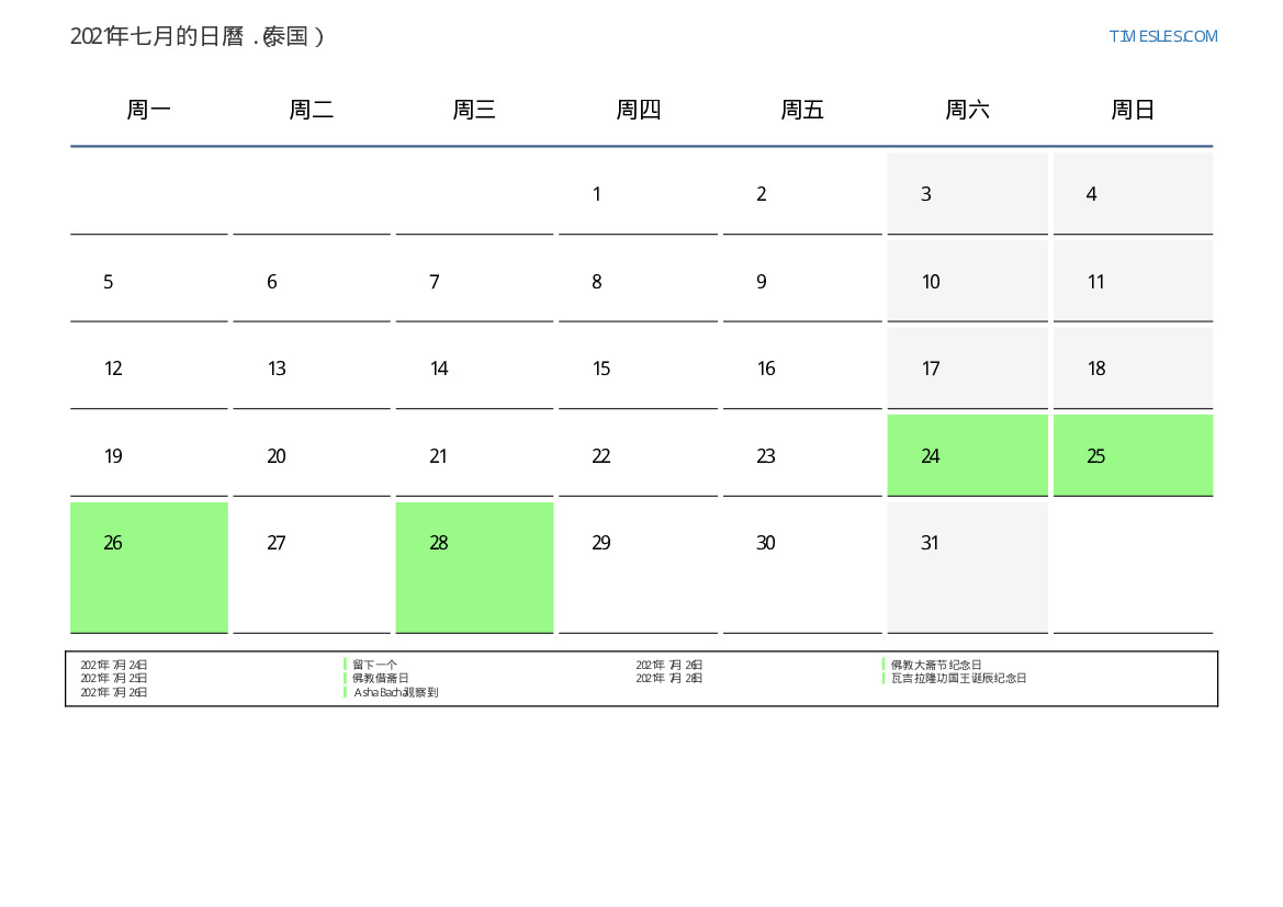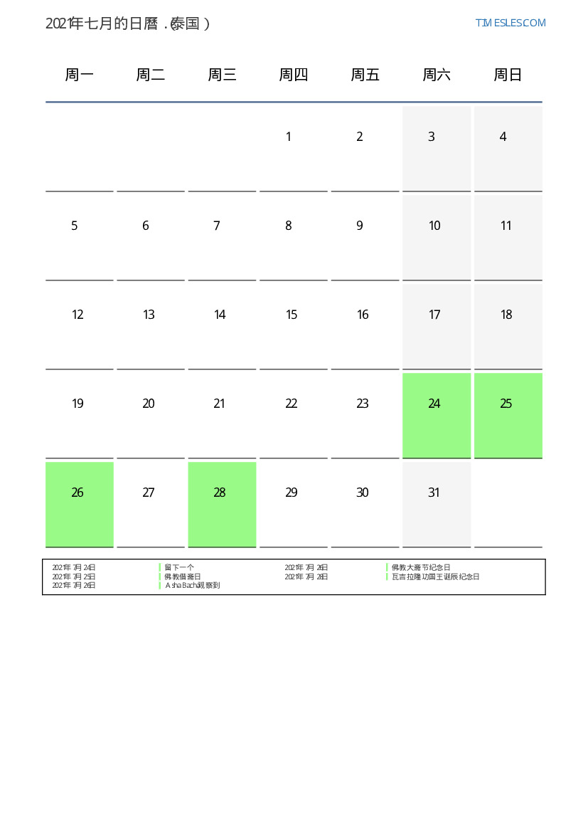 下載並打印2021年七月为泰国節假日和周末的PDF日曆